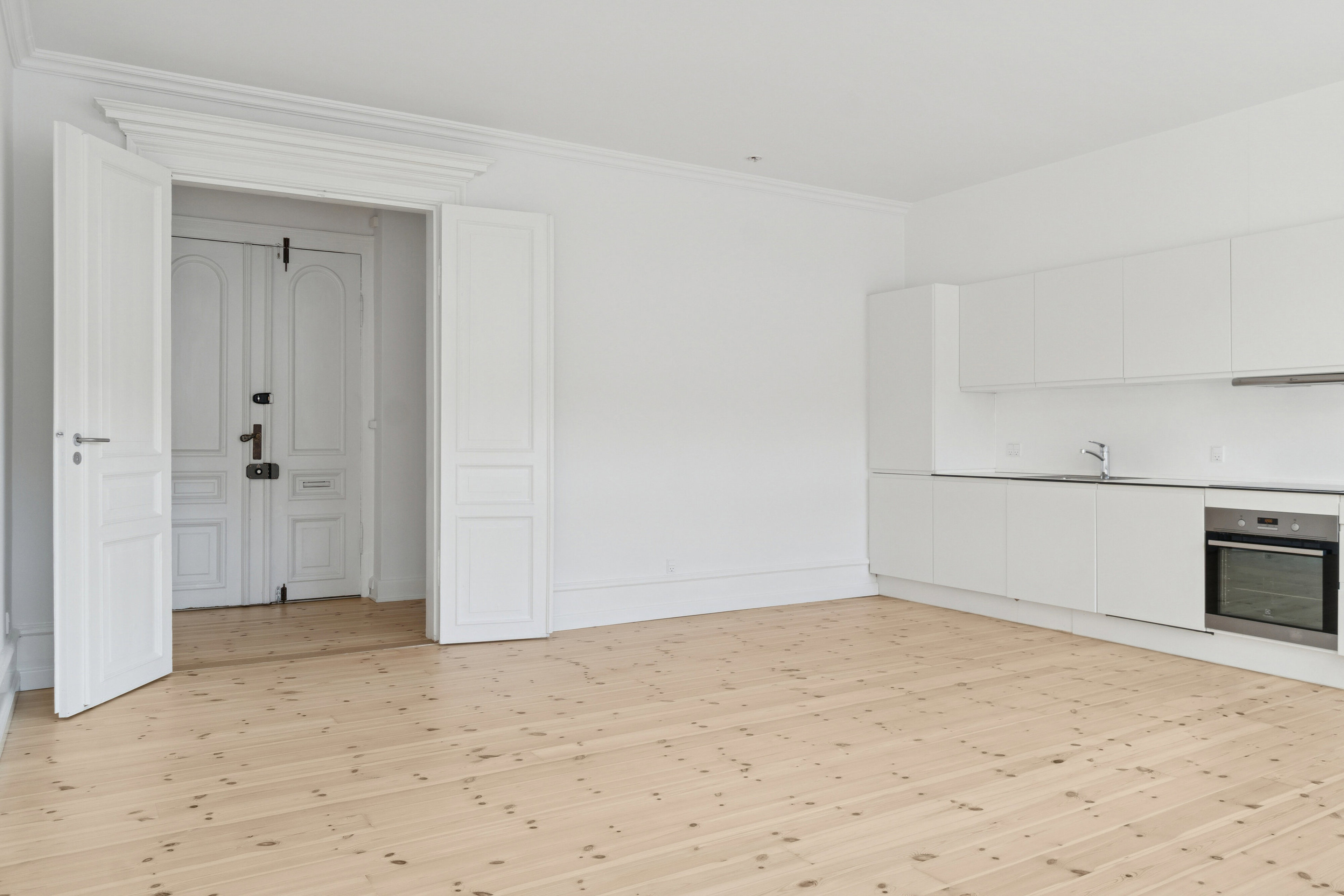 Det starter allerede udefra, hvor facaden byder på smukke fremspring og buede sprossevinduer. Inden døre skal du fortsætte oplevelsen i det åbne opholdsmiljø, hvor køkkenet og stuen forenes. Rummet byder på stuk og det nydelige gulv, og karnappen er en ekstra charmerende detalje, som giver masser af lys. Køkkenet er stilrent i et nordisk look, der ikke stjæler opmærksomheden. Den dobbelte fløjdør og dørportalen er med til at højne det hele yderligere. Videre skal du se værelset og det stilrene badeværelse med separat bruseniche, ligesom det er en fordel med opbevaringspladsen i entréen.