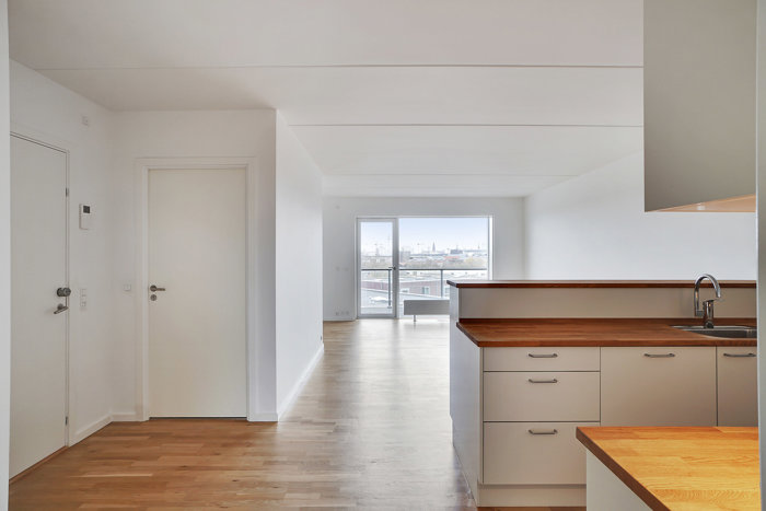 Alle lejligheder er meget indbydende med lyse egetræsgulve og hvide vægge. Boligerne har flotte Invita køkkener og er udstyret med en stor altan eller en lækker stor terrasse. Der er elevator, så du nemt kan komme op til din lejlighed på de øverste etager.
