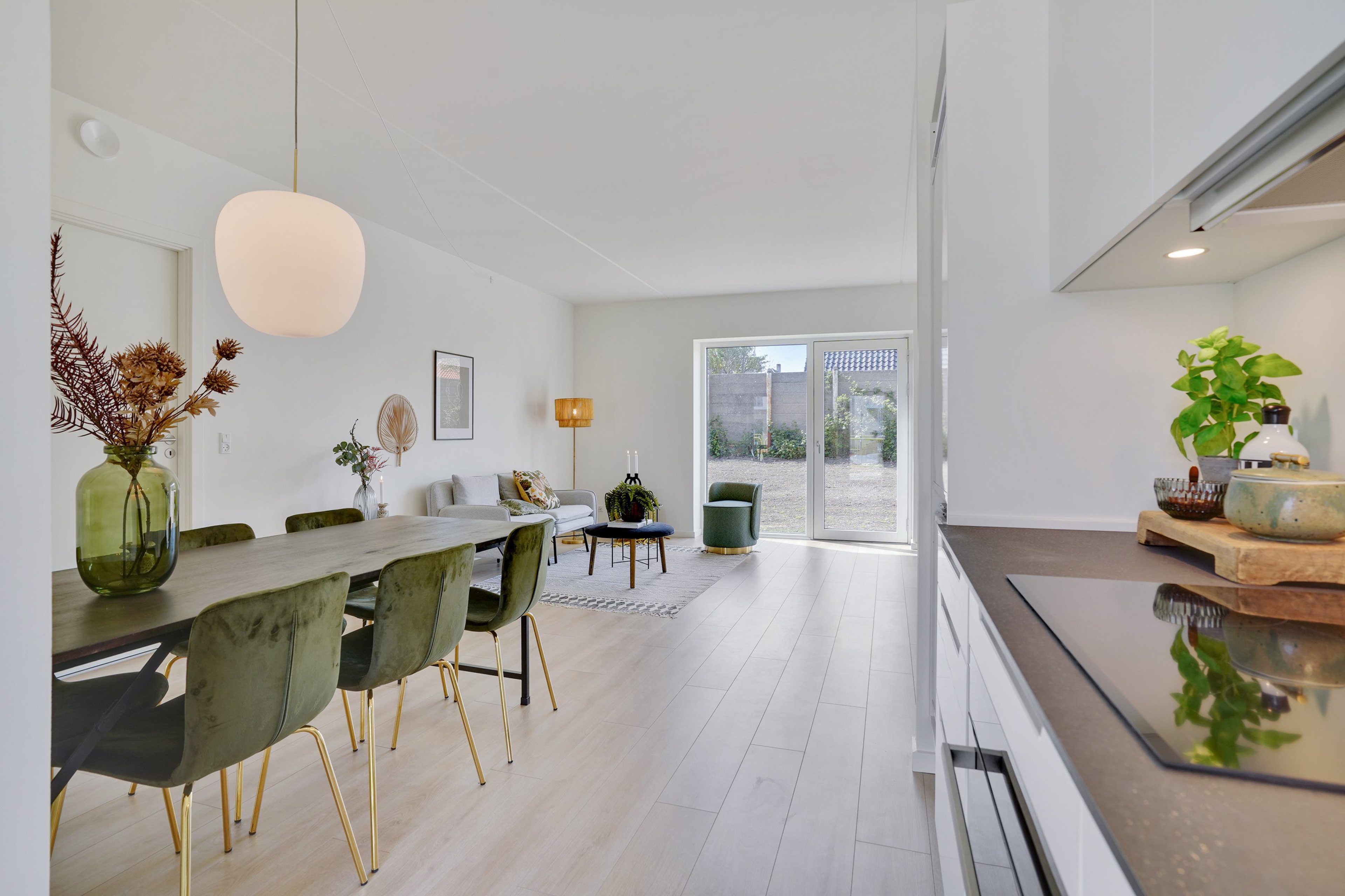 Materialevalget understøtter bebyggelsens generelle moderne nordiske stil. Opholdsrummene har rustikke asketrægulve, som er både smukke og praktiske. Køkkenelementer er i minimalistisk design fra Invita i modehvid. Grebene er indfræsede og optager dermed ikke plads, men giver i stedet både rene linjer og høj funktionalitet. Alle hårde hvidevarer er fra Siemens.