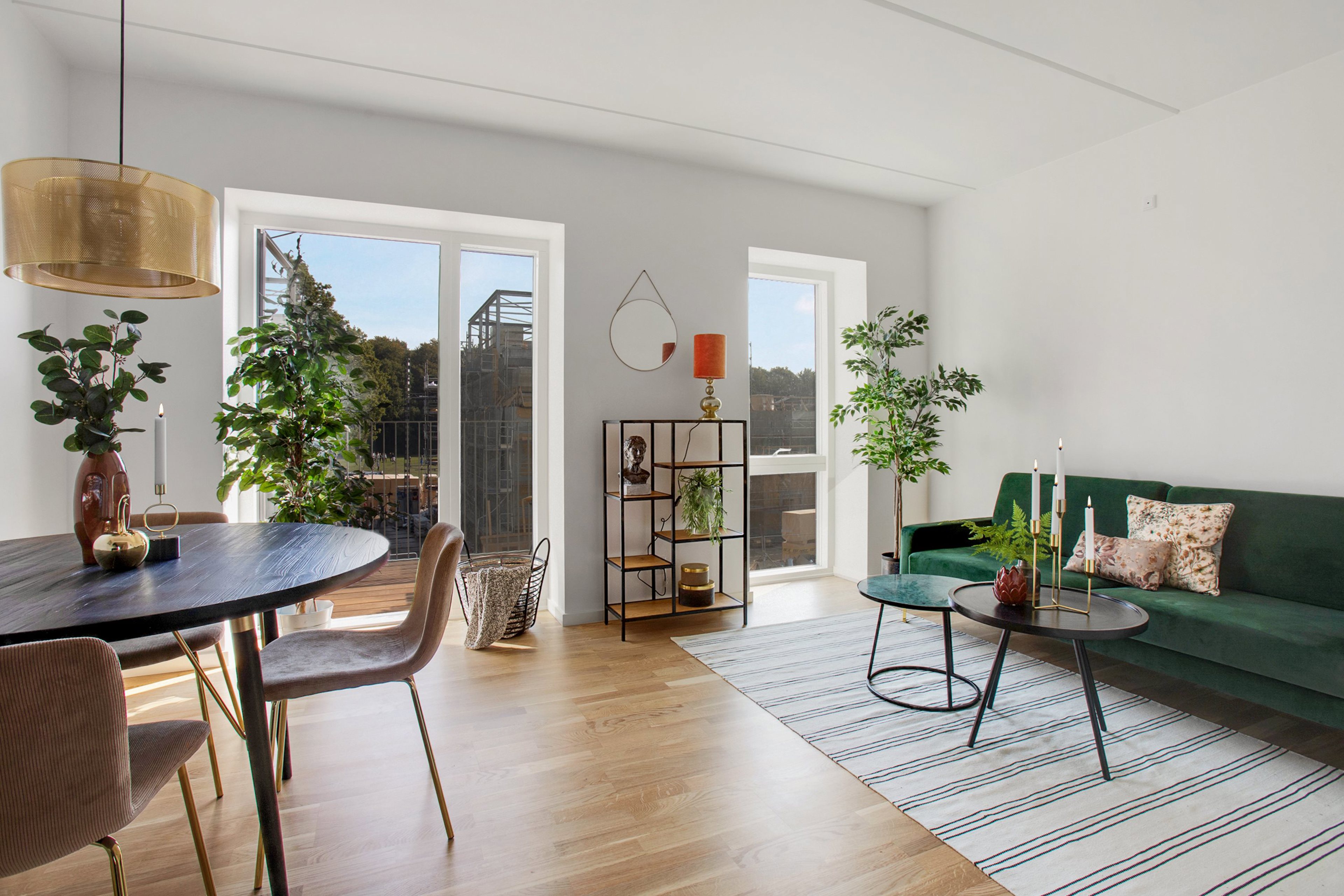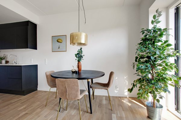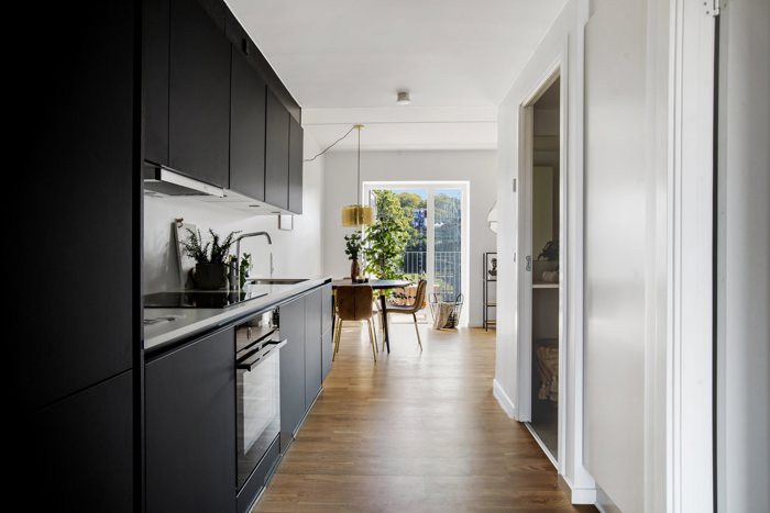 Hjertet i boligen er det stilrene, sorte Invita-køkken, som rummer masser af opbevaringsplads og er fuldt udstyret med både køleskab, fryser, opvaskemaskine, kogeplader, ovn og emhætte. Køkkenet ligger i åben forbindelse med stuen, hvilket skaber et dejligt alrum med plads til både hygge og madlavning, og herfra kan du træde direkte ud på lejlighedens altan. Boligen fremstår moderne med flotte parketgulve i eg, som komplementerer ejendommens markante arkitektur med murstensfacader og de karakteristiske afrundede hjørner.