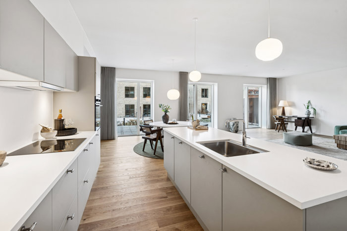 Velkommen til denne indbydende og velindrettede 3-værelses lejlighed, hvor moderne komfort og funktionalitet går hånd i hånd. Boligen byder på et stort og åbent opholdsrum, hvor køkken og stue smelter naturligt sammen og skaber et lyst og imødekommende hjerte i hjemmet. Køkkenet er praktisk indrettet med god bordplads og en køkkenø, som både fungerer som arbejdsstation og samlingspunkt i hverdagen. Herfra er der en naturlig overgang til spiseområdet, hvor der er god plads til at samle familie og gæster.