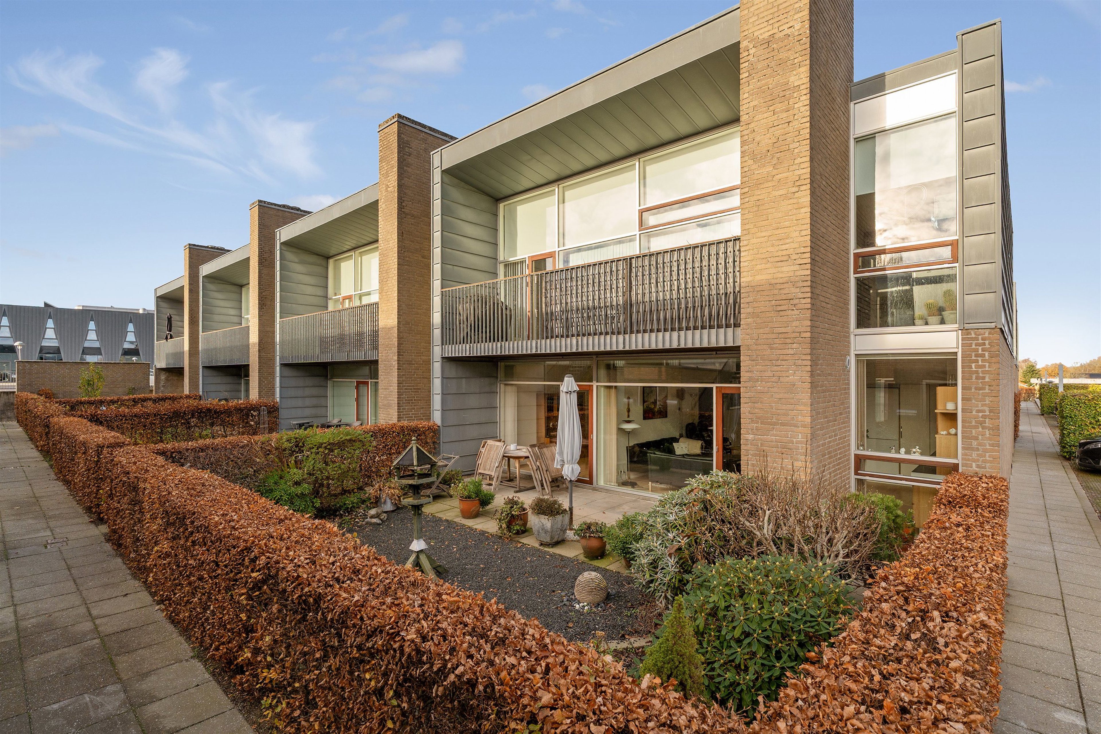 Vedligeholdelsesvenlige vinduer i træ/alu og med oplukkelige døre og vinduer i mahogni.