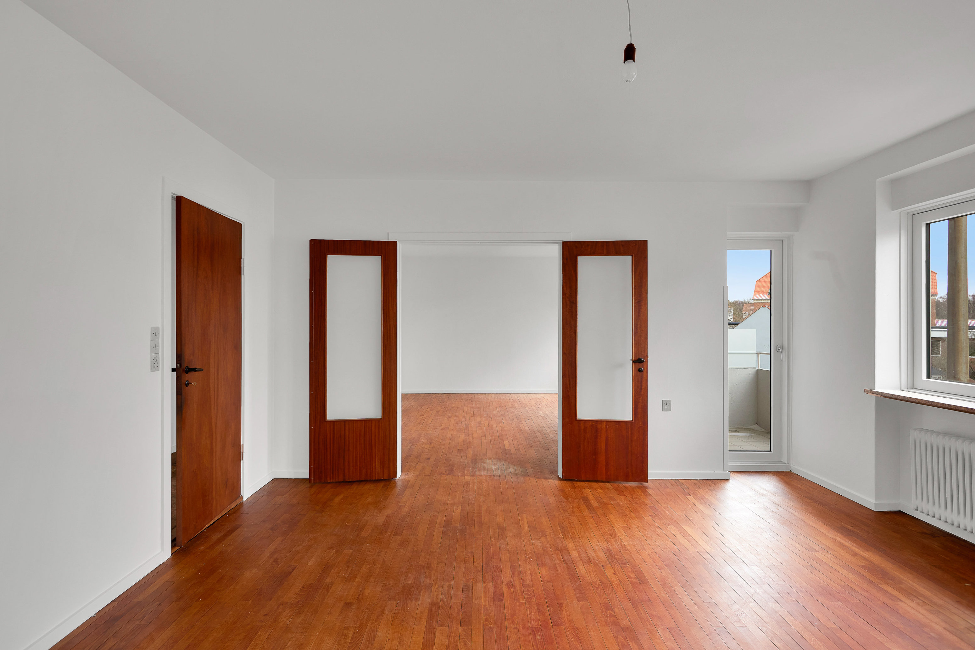 Mod gaden finder man to meget lyse og charmerende stuer en suite, adskilt af en smuk dobbelt døråbning. Den ene stue kan nemt anvendes som ekstra værelse, kontor eller børneværelse. Opholdsstuen rummer både plads til sofagruppe og spiseafdeling og har et skønt lysindfald.