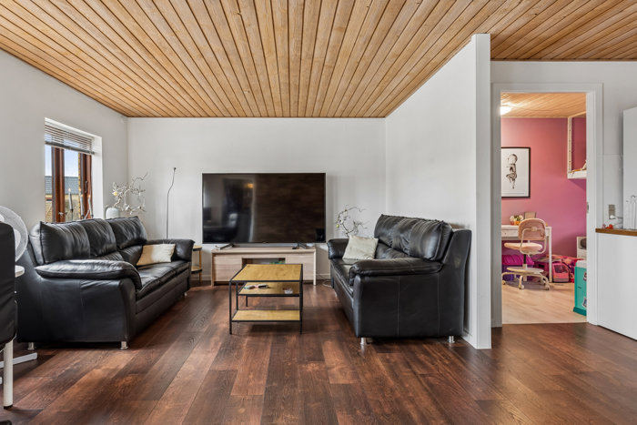 Boligens naturlige samlingspunkt er det lyse og åbne stue-/alrum med integreret køkken. Her strømmer dagslyset ind gennem store vinduespartier og skaber en indbydende atmosfære. Rummet giver god plads til både spiseafdeling og hyggeligt sofahjørne – perfekt til både hverdag og gæster.