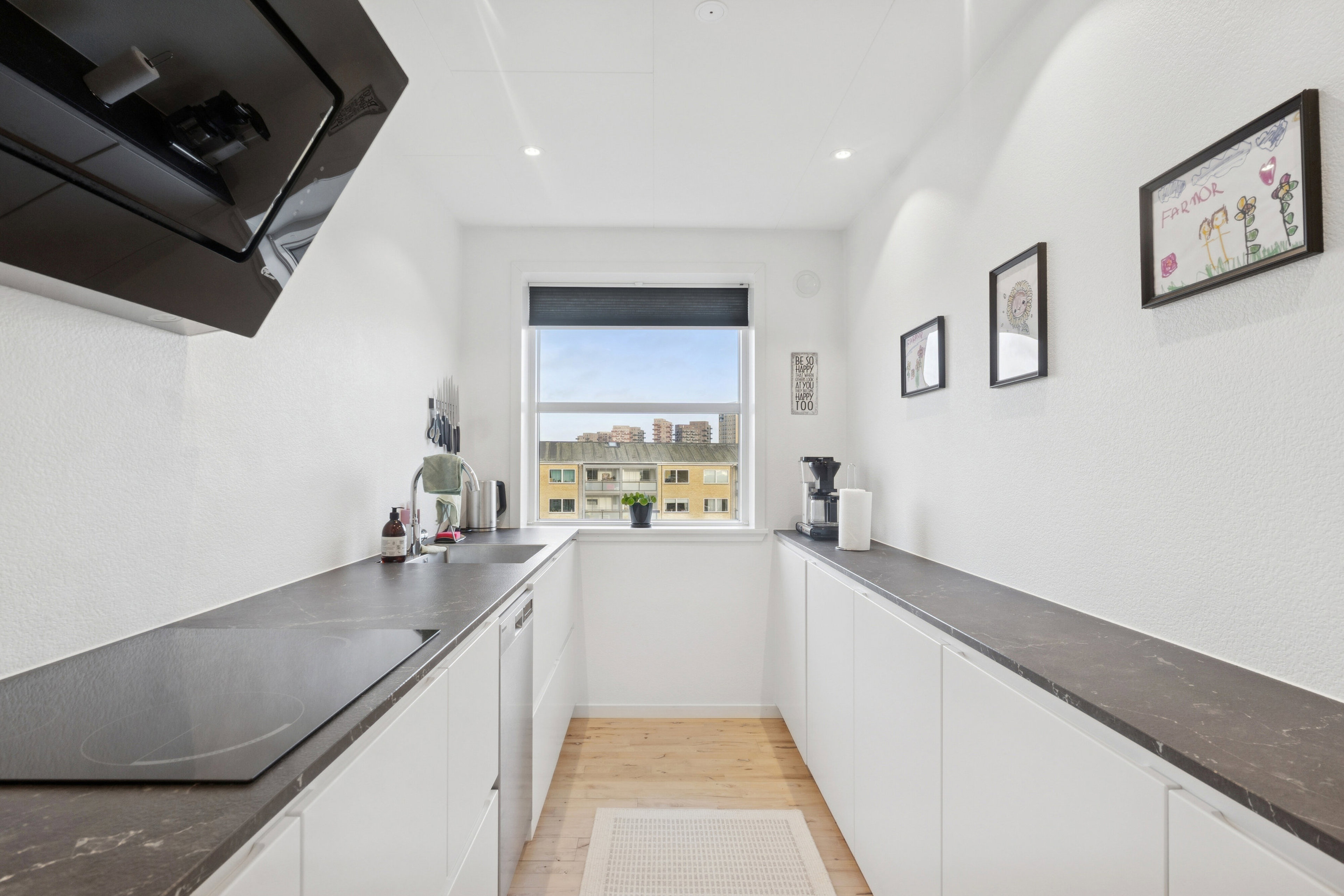 Boligen byder velkommen via en rummelig entré, der skaber en behagelig overgang til resten af lejligheden. Herfra træder du ind i det nye, lyse køkken, der fremstår både elegant og funktionelt – perfekt til madlavning og hverdagens hyggelige stunder.