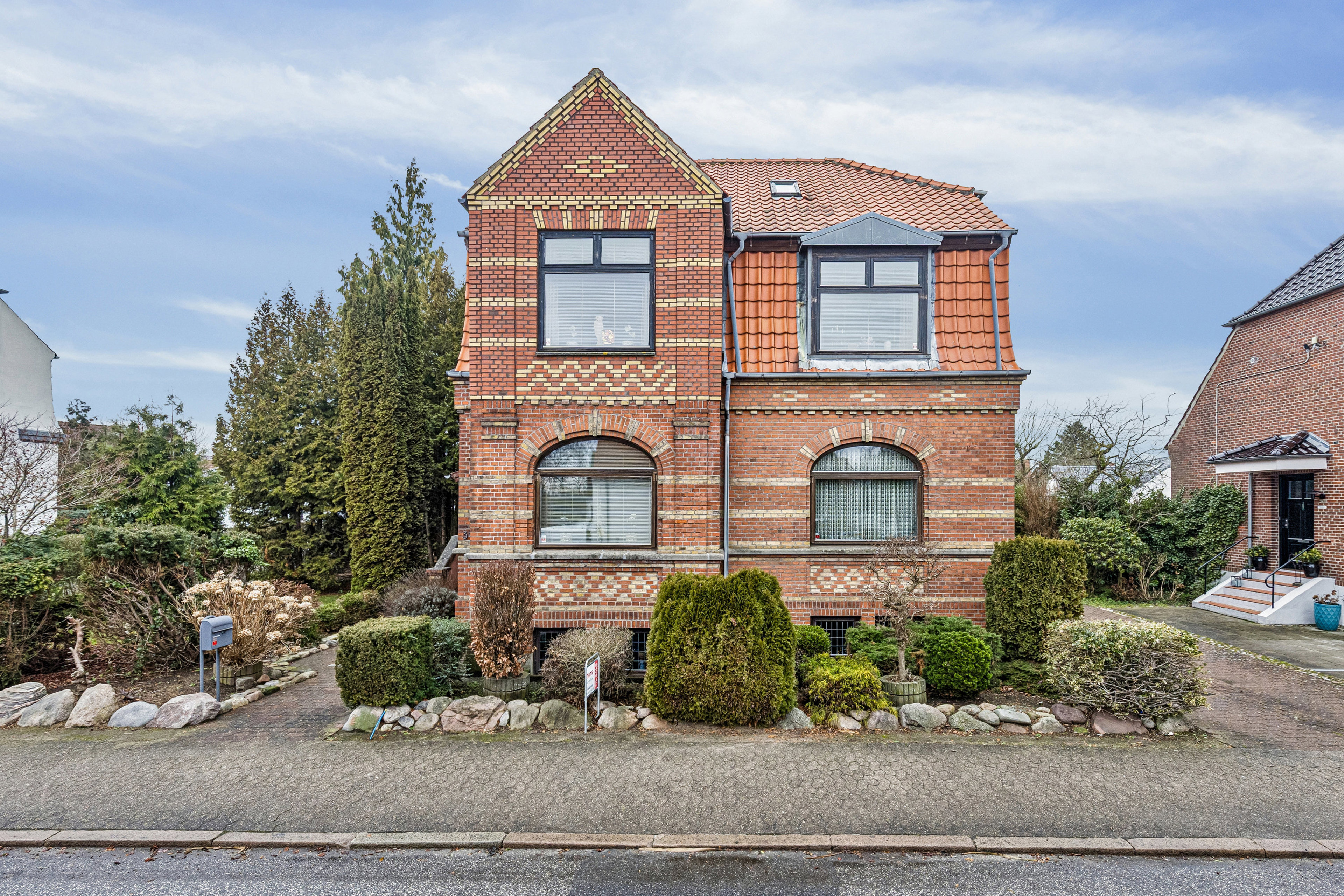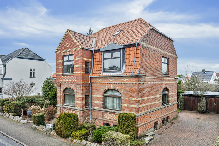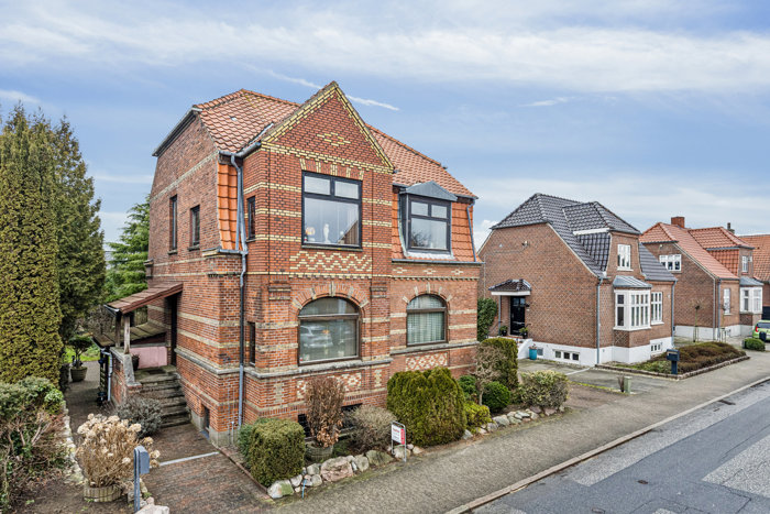 På 6. Julivej 39, et stenkast fra volden, der omkranser Fredericia centrum, finder du denne imponerende villa, der emmer af herskabelig charme og rummelighed. Boligen er opført i hele fire plan – kælder, stueplan, 1. sal samt loftsrum – og byder på en helt særlig atmosfære, hvor klassisk stil møder fleksible anvendelsesmuligheder. Boligen har utroligt mange fine detaljer, som man kun finder i de ældre murermestervillaer – se bare detaljegraden i murværket og det pæne mansardtag.