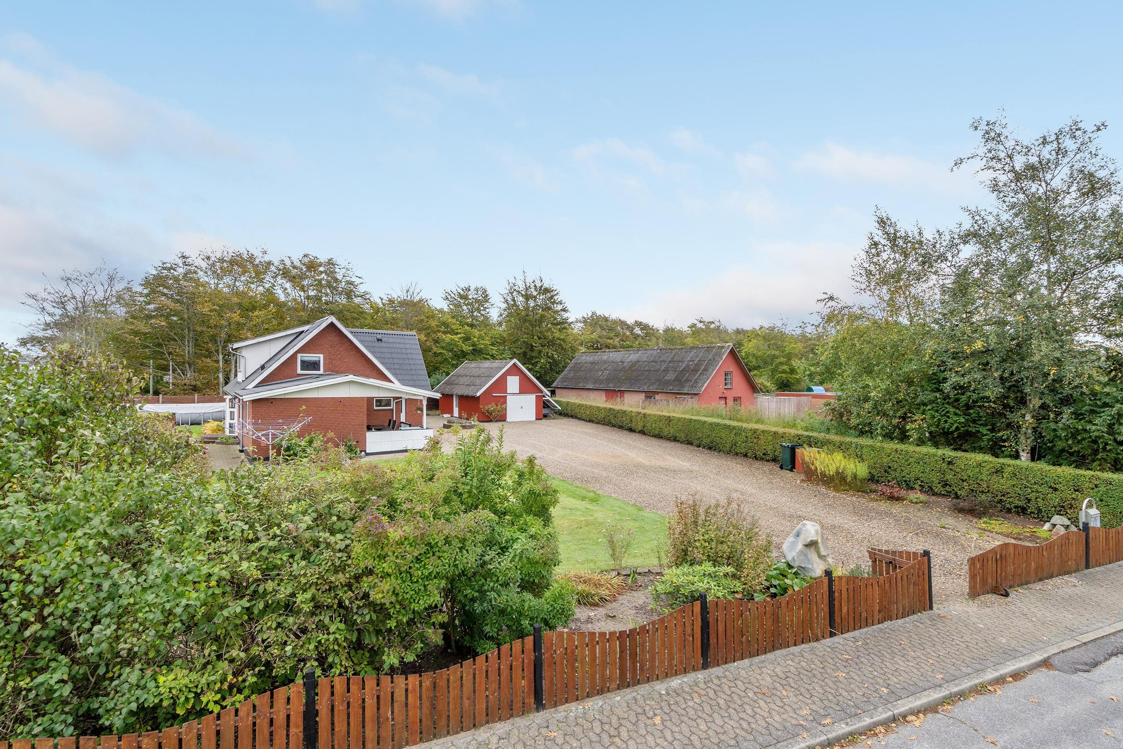 Den store grund er velanlagt med flere terrasser, hyggekroge, frugttræer, bede, stor plæne, stor indkørsel mv.