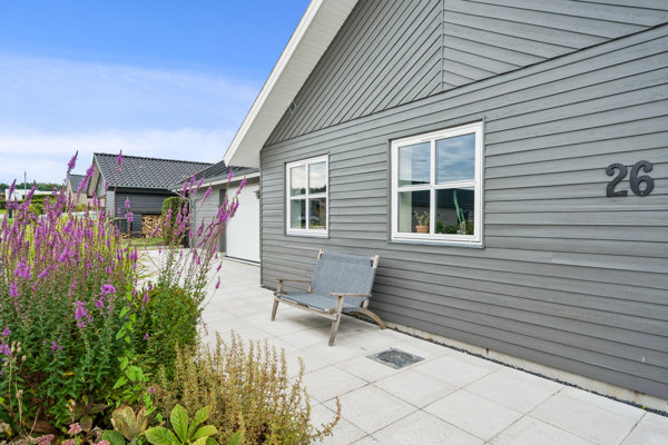 Planløsningen byder desuden på entré, rummeligt bryggers, moderne badeværelse med bruseniche samt tre gode værelser. Overalt i villaen er der gulvvarme, og en tydelig rød tråd i materialevalget sikrer en harmonisk helhed.