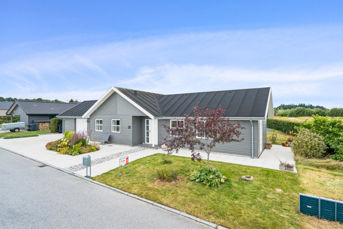 Her får du en villa, der kan det hele: en skøn beliggenhed med fred og ugenerthed, en have som indbyder til afslapning og leg, og en bolig, der med sine 158 veludnyttede kvadratmeter (plus 51 kvm integreret garage) er både funktionel og stilfuld.