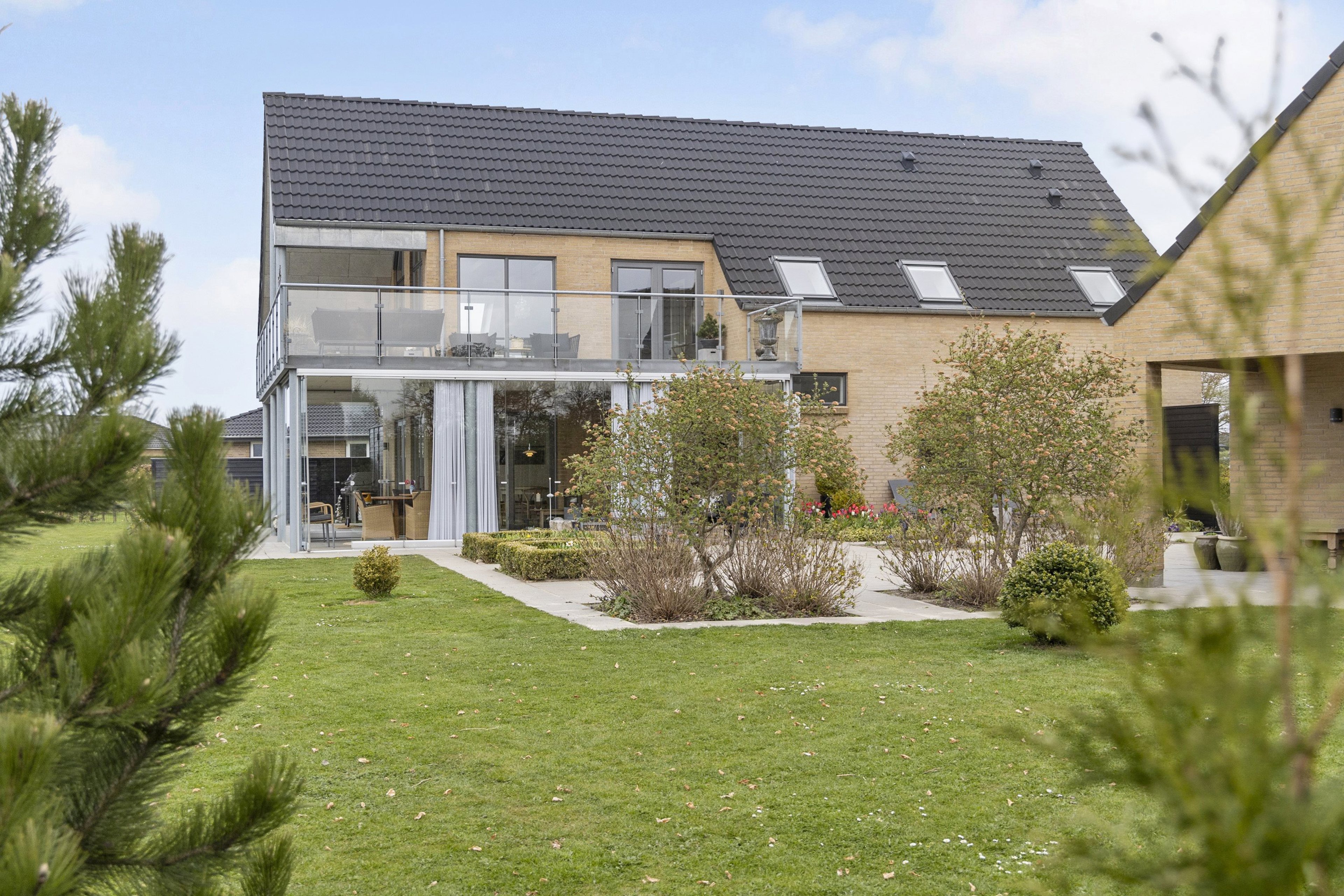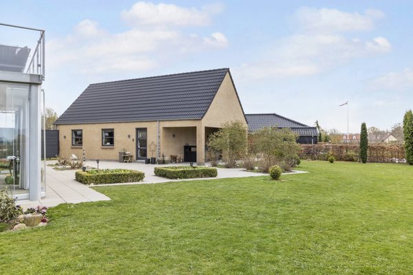 Haven er i sig selv en lille oase – sydvestvendt og anlagt med fokus på både æstetik og lav vedligeholdelse. Her finder du store, flotte flisearealer, velanlagte bede og enkelte smukt placerede træer, der skaber læ og liv året rundt. Det perfekte sted at nyde lange sommeraftener, afslappede weekendmorgener og alt derimellem.