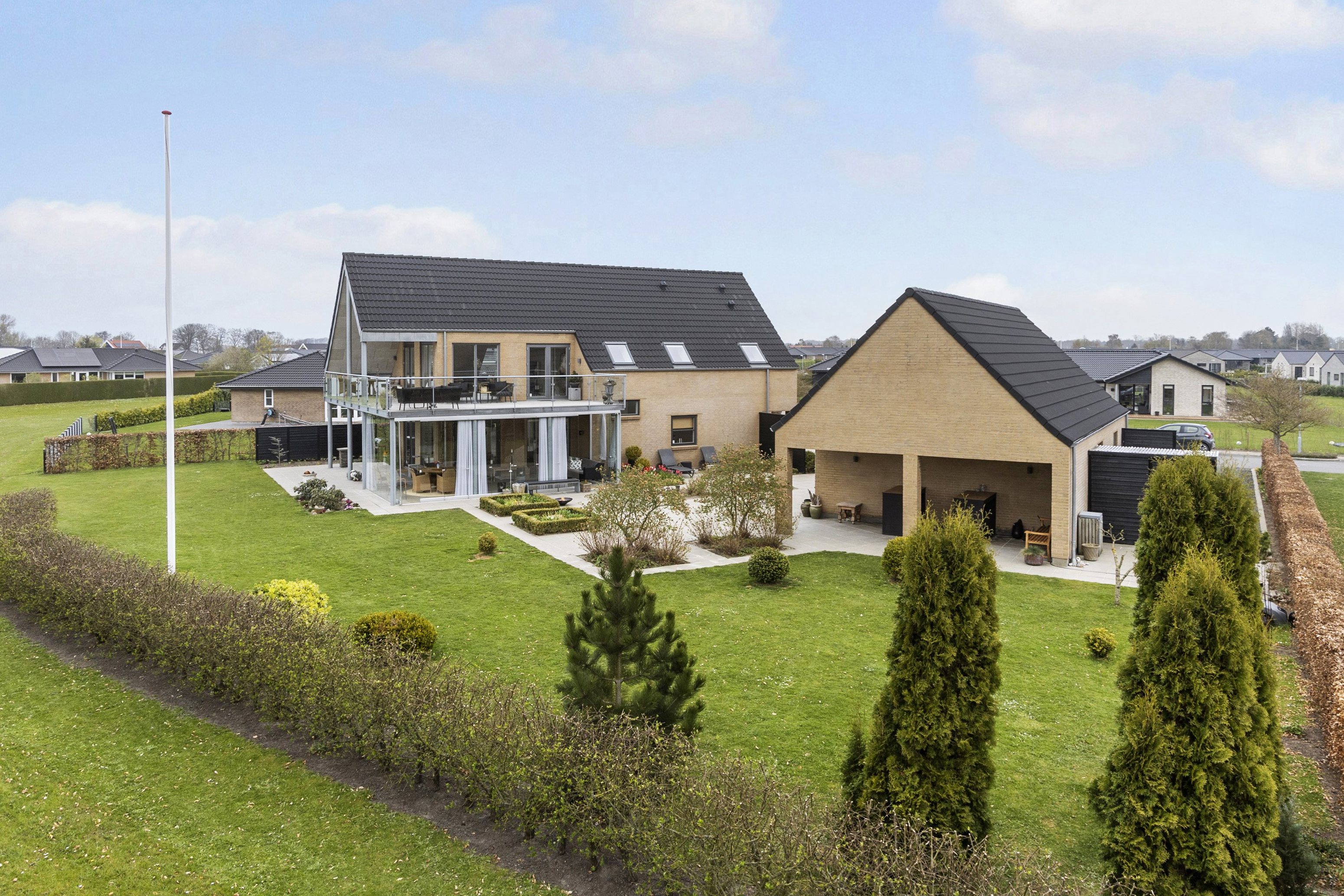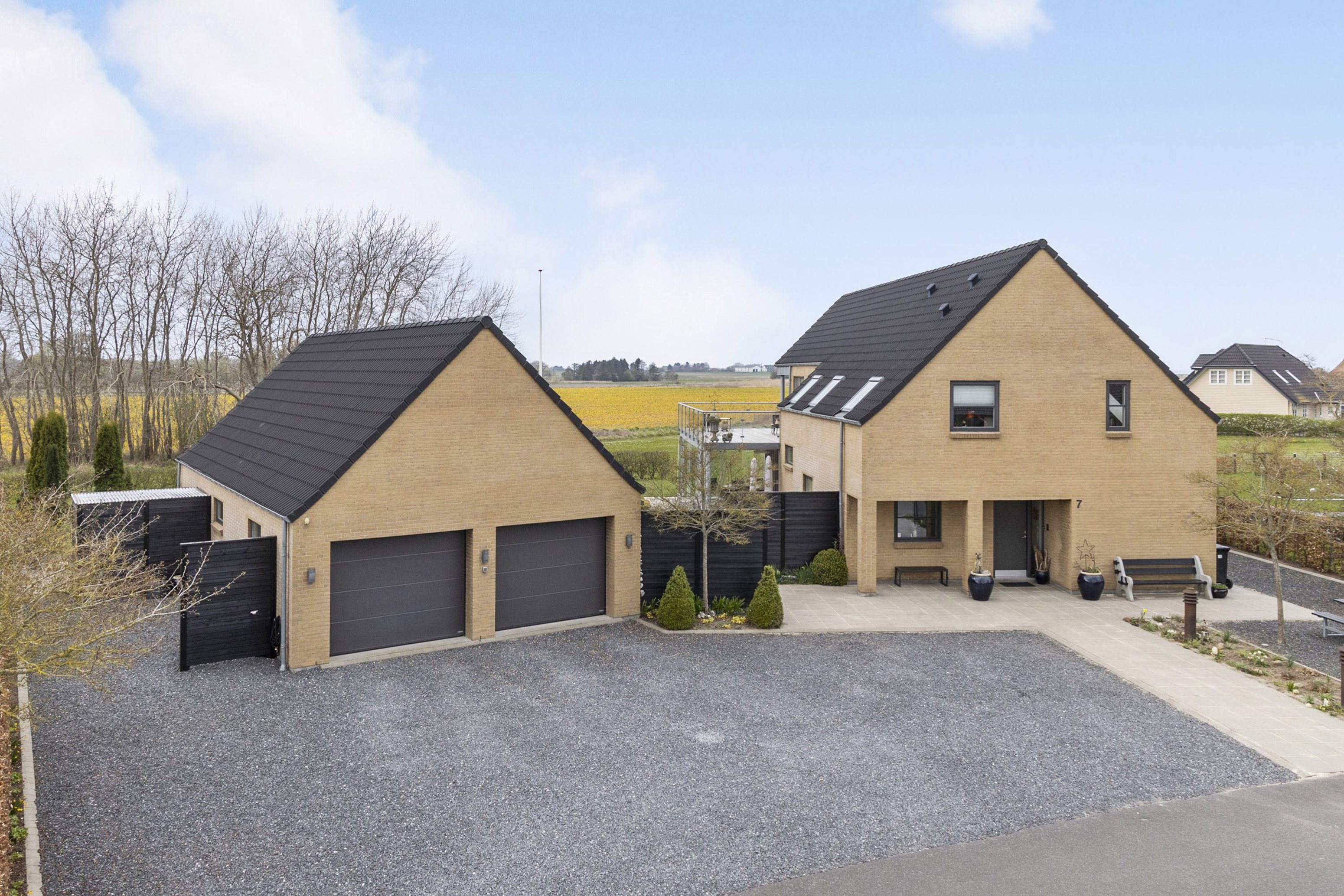 Boligen fremstår arkitektonisk gennemført med en elegant og muret dobbeltgarage på hele 73 m² med gulvvarme og udstyret med el-porte som er ekstra bredde, opbevaringsloft og en praktisk integreret overdækket terrasse – perfekt til udeliv hele året.