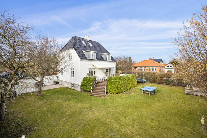 Det er en nydelig ejendom, der pryder på adressen; med en facade, der lyser op, og et mørkt, halvvalmet tegltag til at fuldende den flotte helhed. Carporten med skur og det lyse hegn, der indrammer baghaven, er opført i samme stil som selve huset – og bagtil folder en stor, skøn og afskærmet have med mange hyggekroge sig ud. Her kan I nyde solen i fulde drag, og det samme gør sig gældende for den hævede, sydvendte terrasse, som udgør et pragtfuldt uderum i forlængelse af stuen.