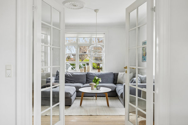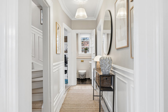 Klassiske vægpaneler og stukkatur smyger sig fra rum til rum. Husets stueplan byder på et værelse, et gæstetoilet samt to stuer en suite og et køkken, som forbindes af franske dobbeltdøre, der lader lyset strømme gennem leverummene. Førstesalen fordeler tre store værelser og et badeværelse foruden en repos, mens kælderen supplerer med endnu et stort badeværelse, der har karbad og brus, et tekøkken og to gode, disponibelt rum, der alt sammen fremstår i boligstandard – perfekt til en teenage- eller gæsteafdeling.