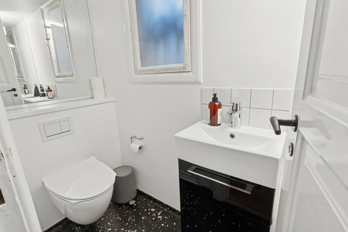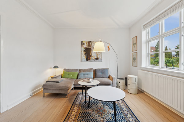 Når du lader blikket vandre indendørs, er det uden tvivl stukken, de sprossede vinduer og de blotlagte bjælker, der stjæler opmærksomheden. I stueplan finder du et skønt værelse med hems, et gæstetoilet, et badeværelse og ikke mindst et vidunderligt køkken-alrum, hvor du frit kan tale med gæsterne ved spisebordet, mens du ordner det sidste til aftenens måltid. Bemærk også de smukke fronter og den åbne forbindelse til stuen, der fornemt binder sløjfe på opholdsmiljøet. Følger du den smukke, svungne trappe til førstesalen, møder du et badeværelse samt to værelser, der også er beriget med hver deres hems. Opbevaring, hobbysysler og vasketøj er der rigelig plads til i kælderen, der både har et bryggers, tre disponible rum og egen indgang.