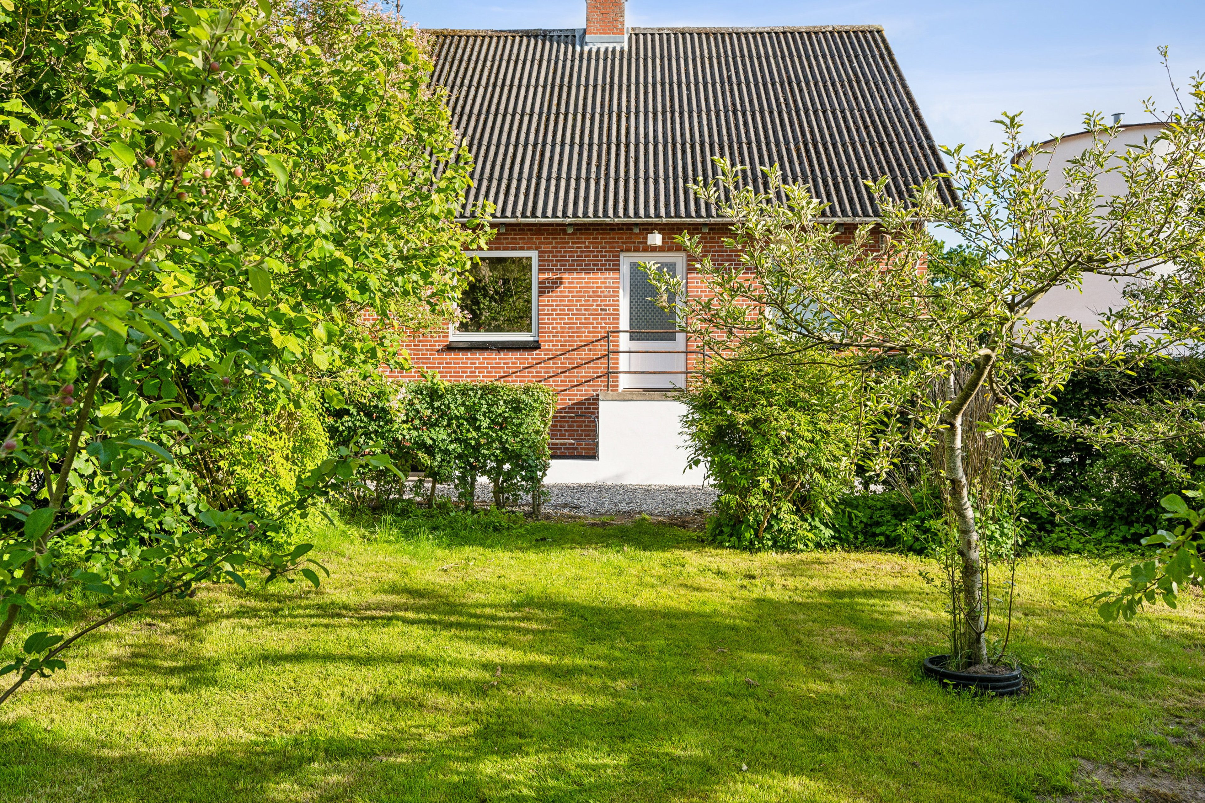 Udenfor venter en stor have med direkte nærhed til naturen. En stemningsfuld sti langs marken fører ned til en hyggelig legeplads, og den korte køretur til Lyngså Strand gør beliggenheden særligt attraktiv for både hverdags- og fritidsliv.