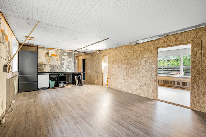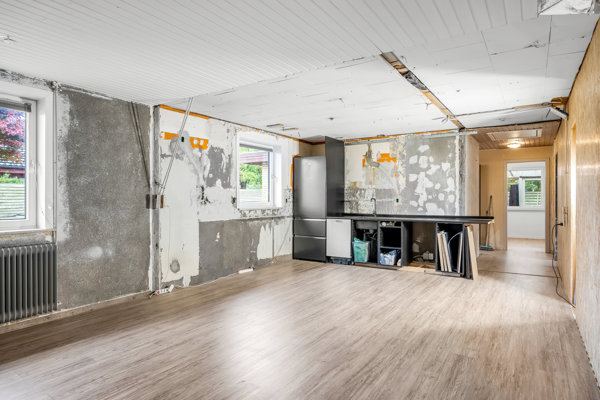 Indenfor mødes du af en planløsning, der passer godt til både børnefamilien og til jer, der ønsker mere plads omkring jer. Køkken og stue ligger i åben forbindelse, hvilket giver et stort, lyst opholdsrum. Her er der påbegyndt renovering med nye overflader på vægge, lofter og gulve, så mange af de større ting allerede er sat i gang.