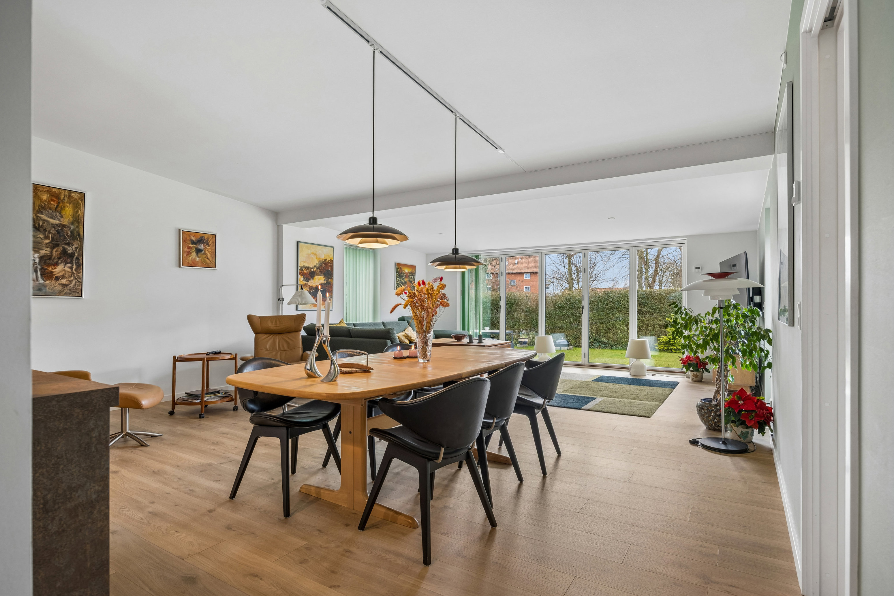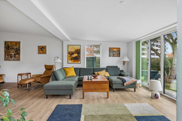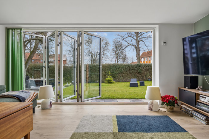 En særlig detalje er den integrerede tilbygning, som tilfører boligen både ekstra kvadratmeter og en fantastisk rumfornemmelse. Her skaber de store vinduespartier fra gulv til loft et enestående lysindfald, og når de skydes helt til side, smelter inde og ude sammen og inviterer haven helt ind i boligen. Det giver en unik oplevelse af luft, lys og nærhed til det grønne.