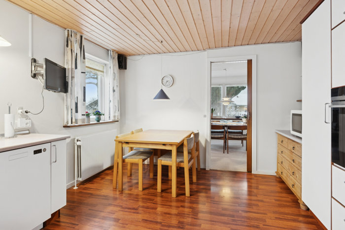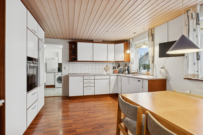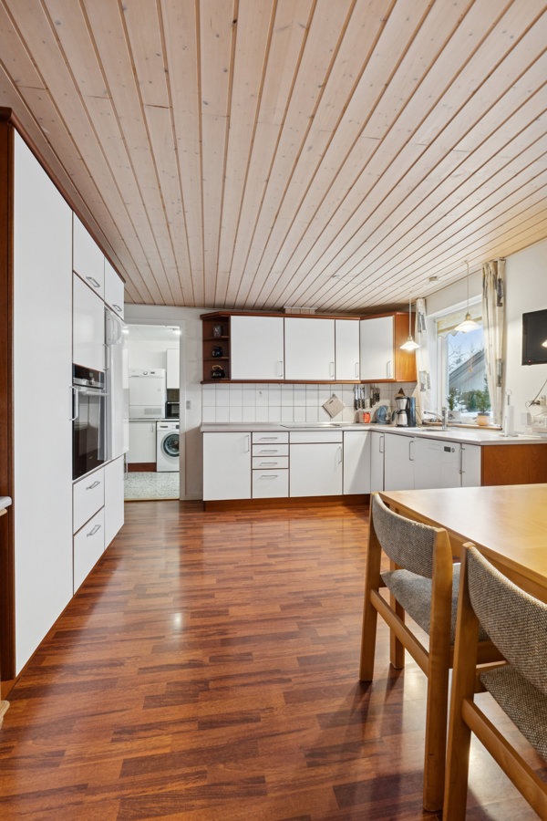 Køkkenet ligger separat, men med en placering og størrelse, der gør det oplagt at tænke i nye løsninger. Ønsker man et mere åbent rumforløb med køkken og opholdsrum samlet, er der gode muligheder for at etablere det og skabe et moderne samlingspunkt i huset. Indtil da fungerer køkkenet fint som et praktisk og roligt arbejdsrum i hverdagen.