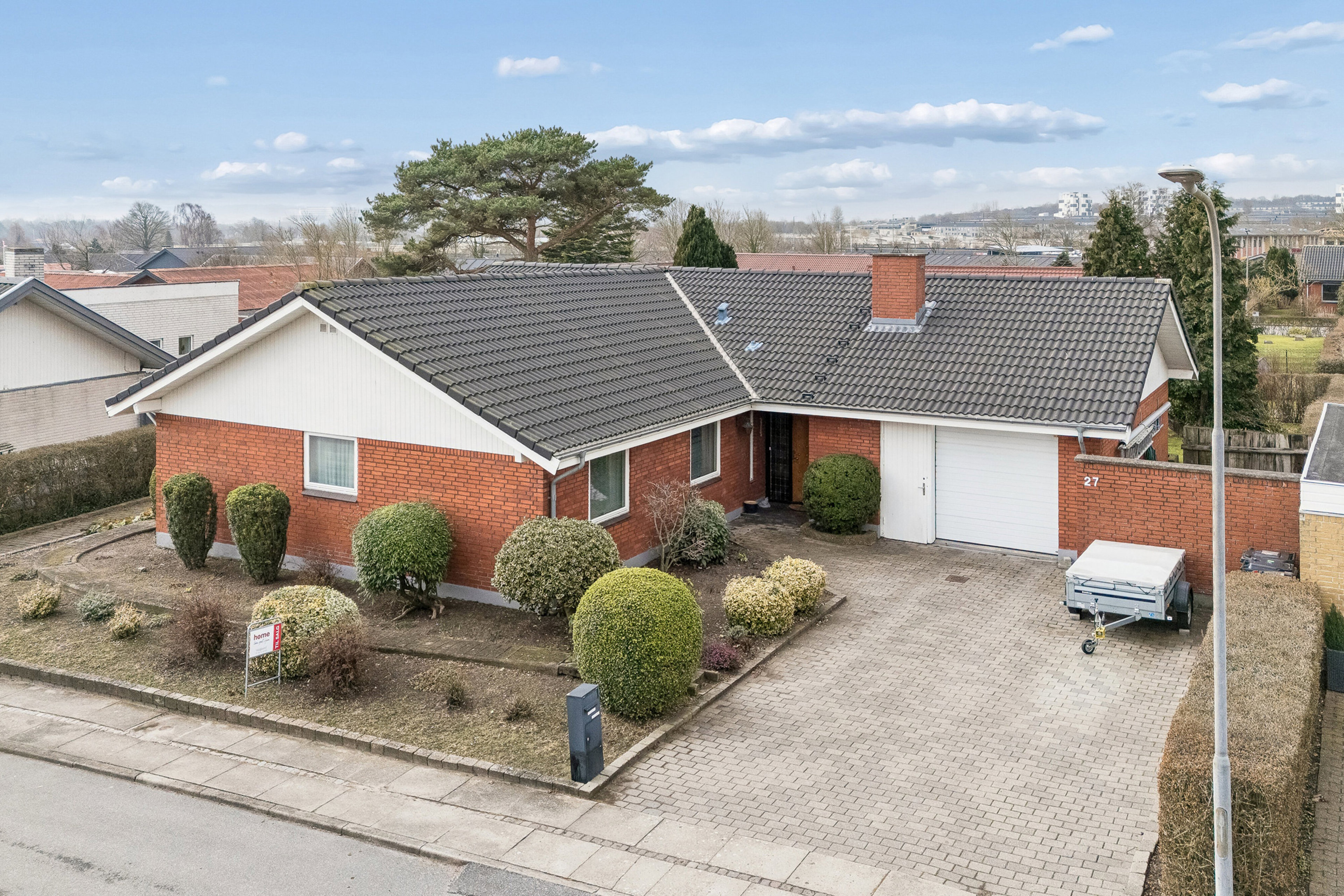 Udendørs finder du flere terrasser, så der altid er mulighed for at finde sol eller læ. Haven er overskuelig og indbyder til både leg, afslapning og stille stunder. Garagen ligger praktisk i forbindelse med huset og gør hverdagen nem.