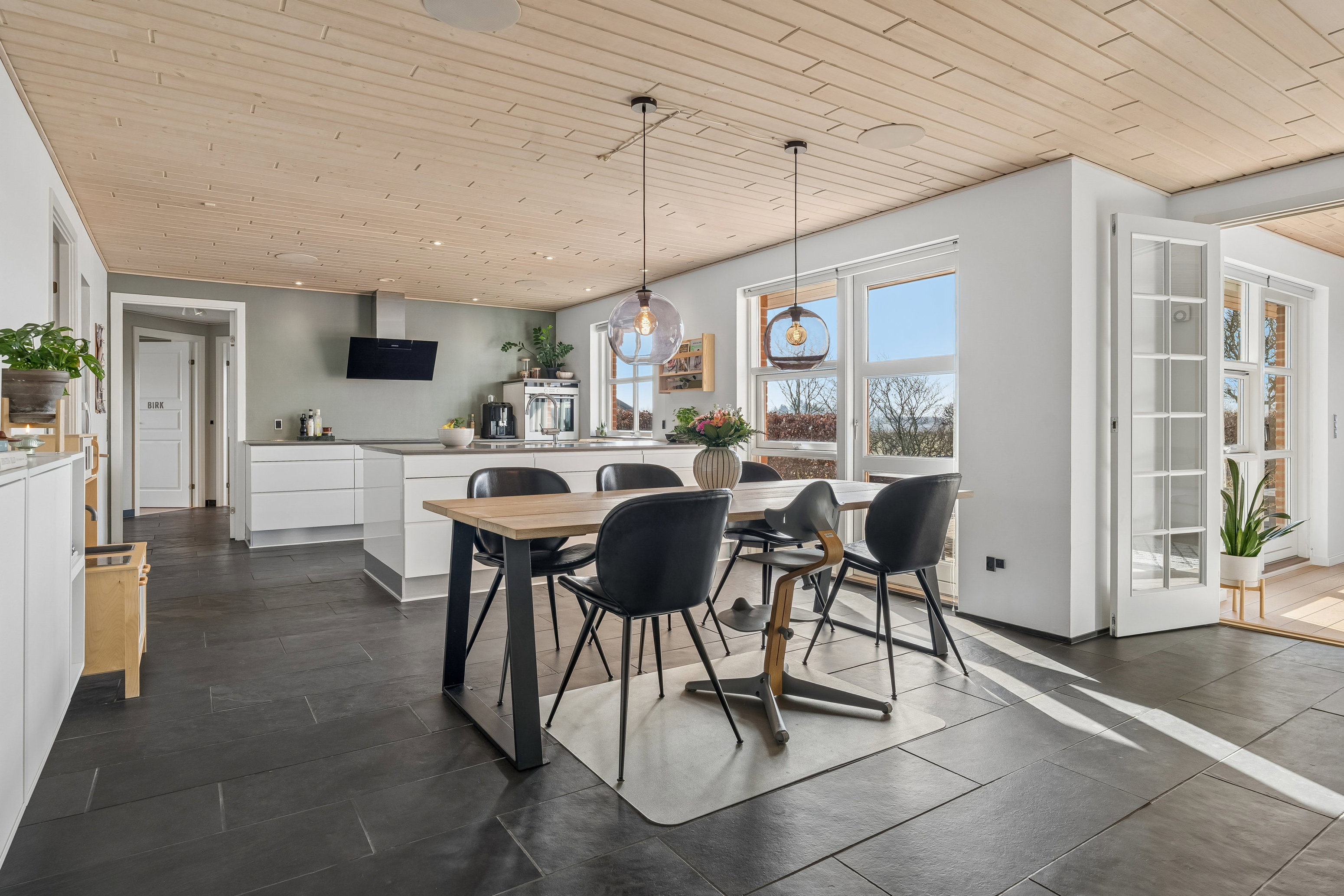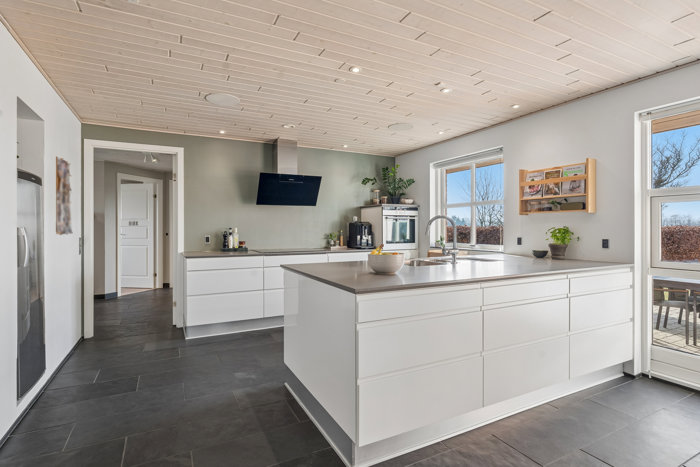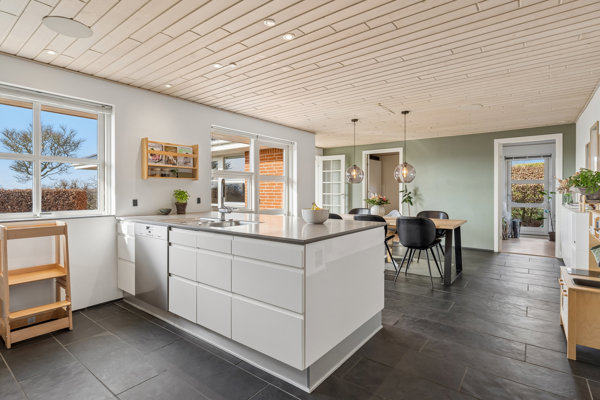 Her mødes man af en lys og indbydende entré, som fører videre ind i boligens hjerte – det rummelige køkken/alrum med direkte forbindelse til den sydvestvendte terrasse og have. Det oplagte samlingspunkt med enestående lysindfald, hvor store vinduespartier trækker dagslyset ind og skaber en varm og behagelig atmosfære til både hverdag og weekendens sociale stunder. Fra køkken/alrummet er der åbne kig til opholdsstuen, som med sine store vinduespartier også tilbyder udsigt over grønne arealer med heste, der græsser – en sjælden og charmerende detalje, der giver en følelse af plads og natur helt tæt på hjemmets dagligdag.