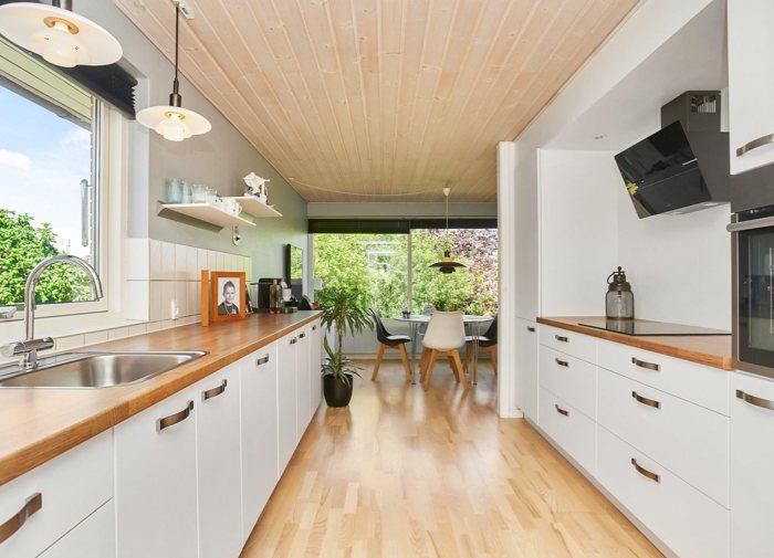 I bydes velkommen i boligens entré med plads til overtøj, alternativt via det pæne og funktionelle bryggers med god opbevaringsplads. Stueplan rummer et skønt og nyere køkken i moderne stil med hvide frontlåger, flot bordplade og rigelig bord- og skabsplads. Her er lyst lamelparketgulv og en hyggelig spiseplads ved det store vinduesparti. Via franske døre er der åben forbindelse til den rummelige og lyse opholds- og spisestue, hvor den hyggelige brændeovn skaber varme og stemning. De store vinduespartier sikrer et fantastisk lysindfald, og herfra er der direkte udgang til en af terrasserne. Endvidere finder I et rummeligt soveværelse med indbygget skab samt et stort badeværelse med lyse klinker, gulvvarme, nyere sanitet og bruseniche.