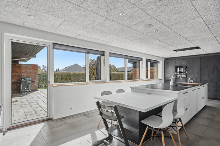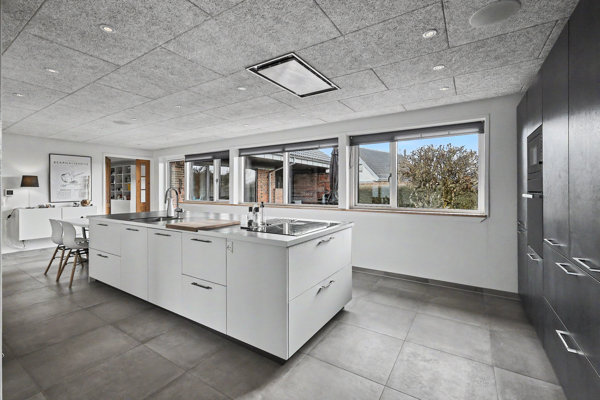 Husets køkken er fra Schmidt som glider naturligt over i et skønt opholdsrum fremstår lyse og indbydende med en behagelig atmosfære, hvor der er plads til både hverdag og gæster. Her er rum til nærvær og samvær – uanset om det er omkring middagsbordet eller i de bløde møbler.