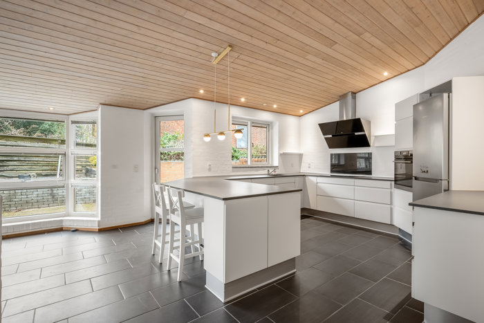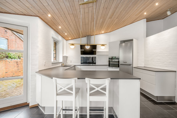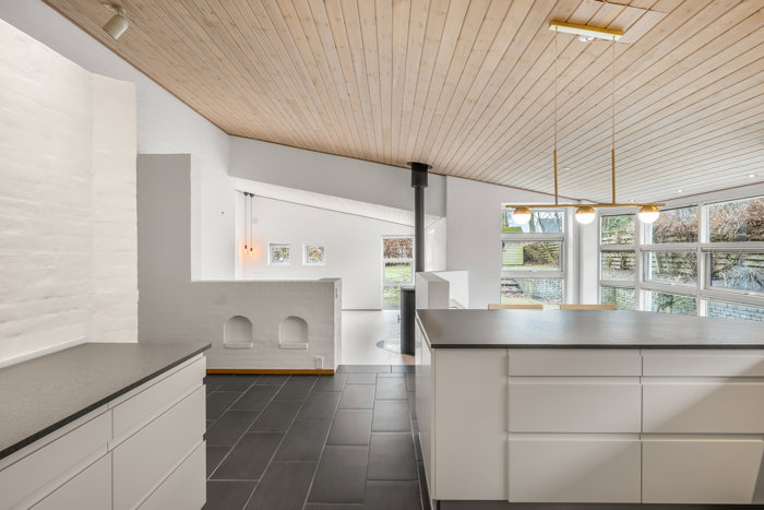 Boligens hjerte er de store, åbne opholdsrum, hvor de forskudte niveauer skaber en spændende dynamik og et flot samspil mellem rummene. De høje lofter til kip giver en fantastisk rumfornemmelse og lader lyset strømme ind, hvilket understreger husets moderne og luftige udtryk. Det nyere, stilrene køkken er indrettet med fokus på både funktionalitet og æstetik og ligger i naturlig forbindelse med opholdsarealerne, så hverdagen og samværet får optimale betingelser.