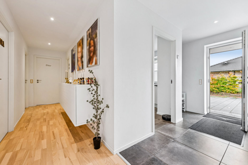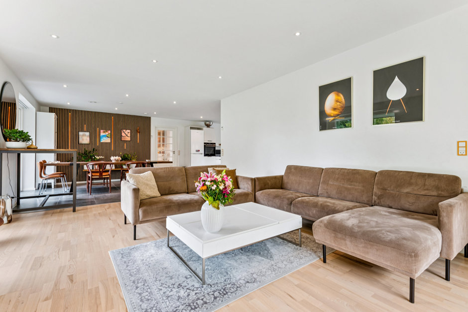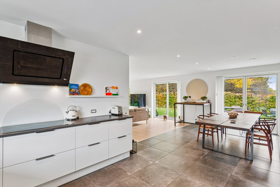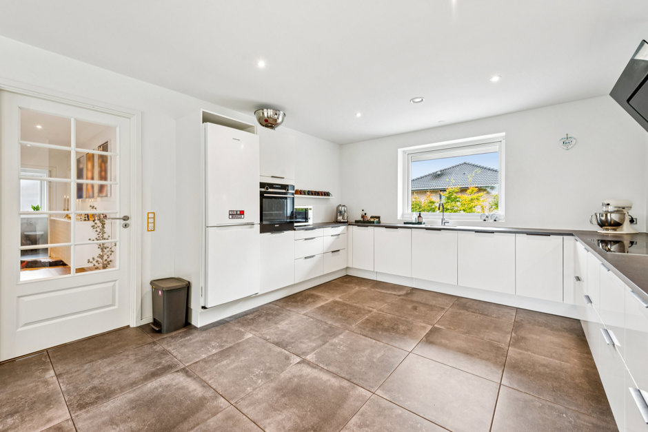 Boligens hjerte er det store, åbne køkken-alrum, hvor flotte gulve og brede vinduer skaber en imponerende rumlighed. Her strømmer dagslyset ind fra flere sider, og de elegante materialer giver en varm og stilren atmosfære. Køkkenet er udført i smukt design med integrerede hårde hvidevarer og masser af opbevaringsplads – et naturligt samlingspunkt for både hverdag og gæster.