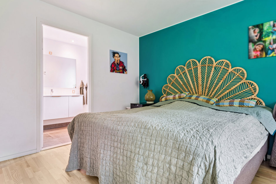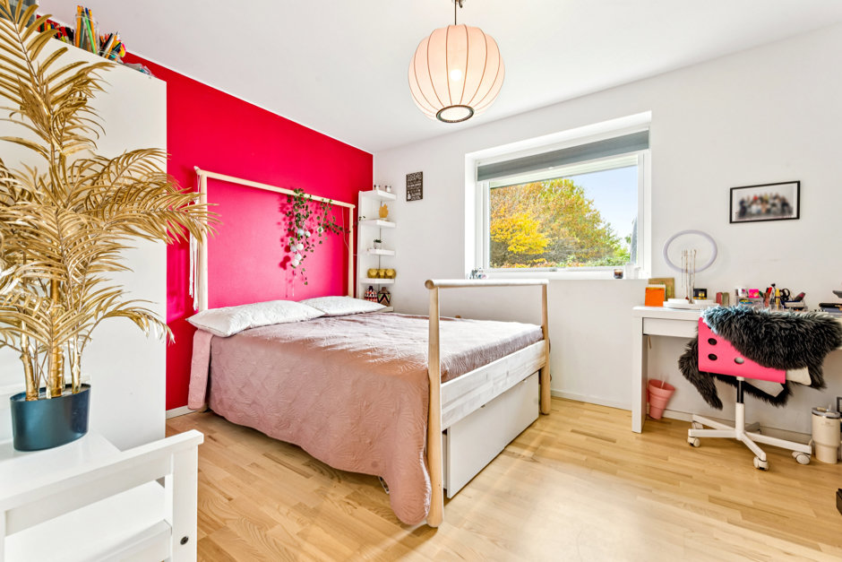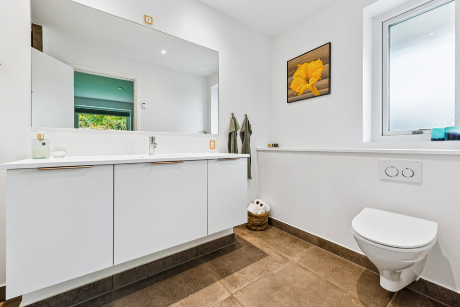 Huset rummer fire gode værelser, heraf et rummeligt soveværelse med adgang til eget badeværelse – et sandt forældreretræte med rolige nuancer og flotte materialer. De øvrige værelser ligger praktisk samlet omkring husets andet badeværelse og egner sig perfekt til børn, gæster eller kontor. Begge badeværelser fremstår moderne med stilrene fliser, væghængte toiletter og lækre detaljer.