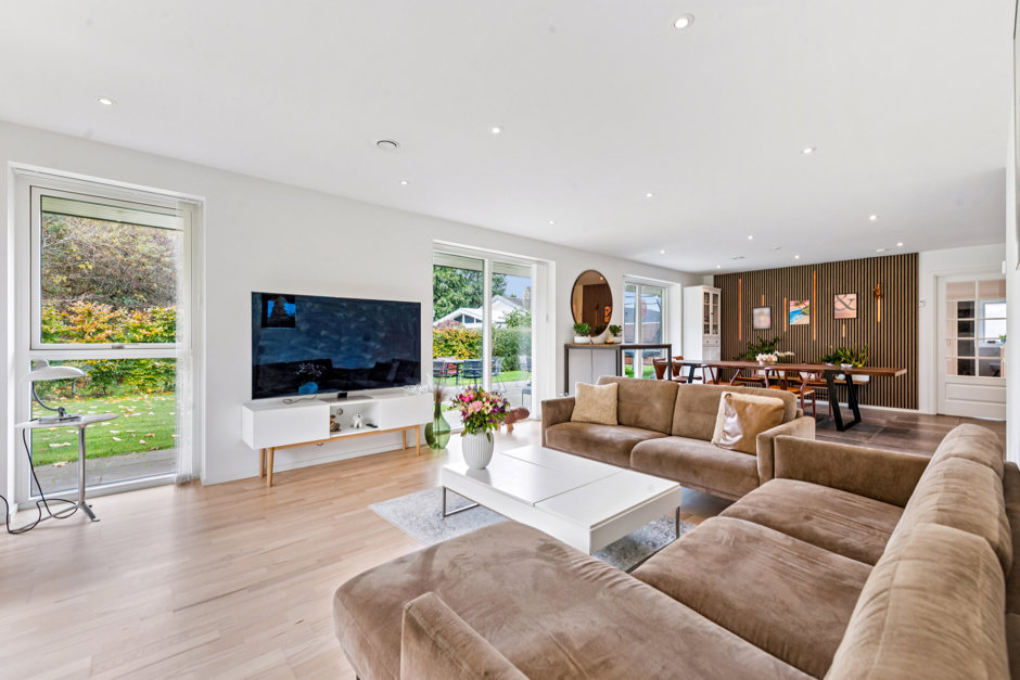 Fra alrummet er der direkte adgang til en skøn syd-vestvendt terrasse og den velanlagte have, hvor du kan nyde solen og den fredelige beliggenhed. Stuen ligger i åben forbindelse med alrummet og giver plads til både afslapning og samvær.