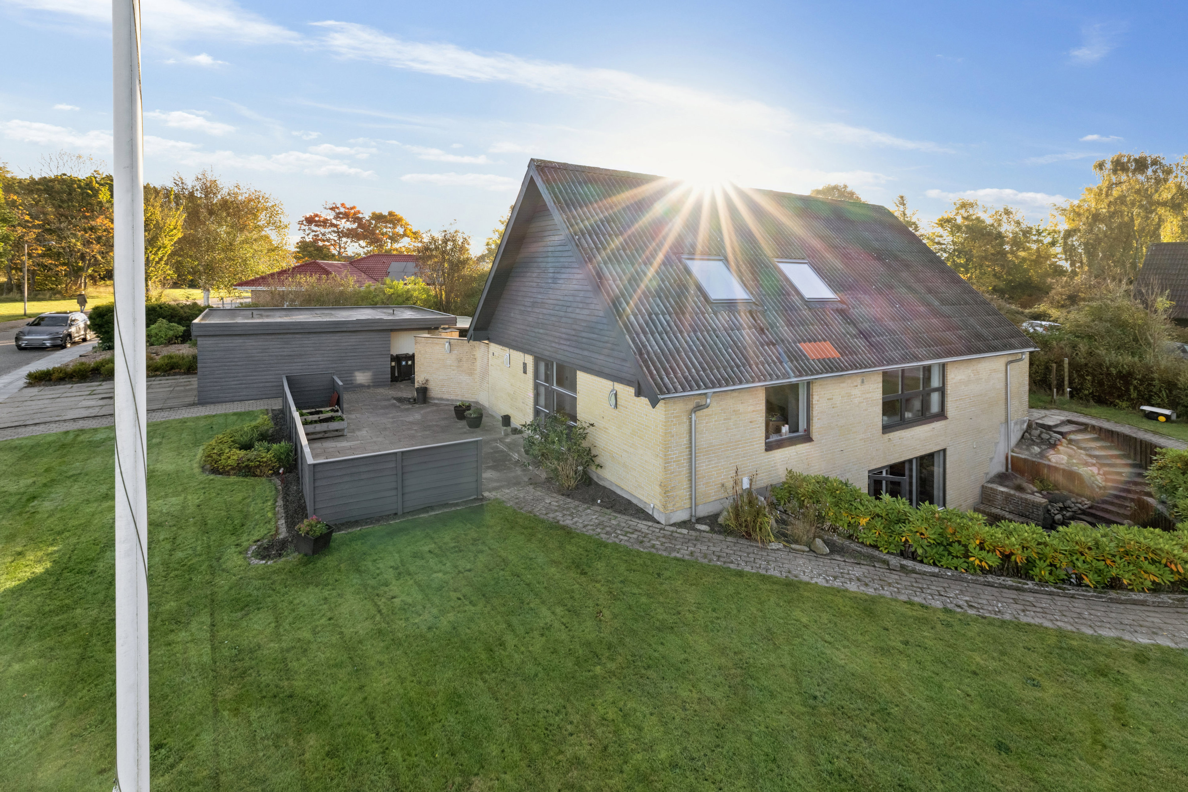 Udenfor venter en stor og brugbar grund, der indbyder til leg, boldspil og udendørs aktiviteter. Der er god carport med værksted i forlængelse – perfekt til hobbyprojekter eller opbevaring.