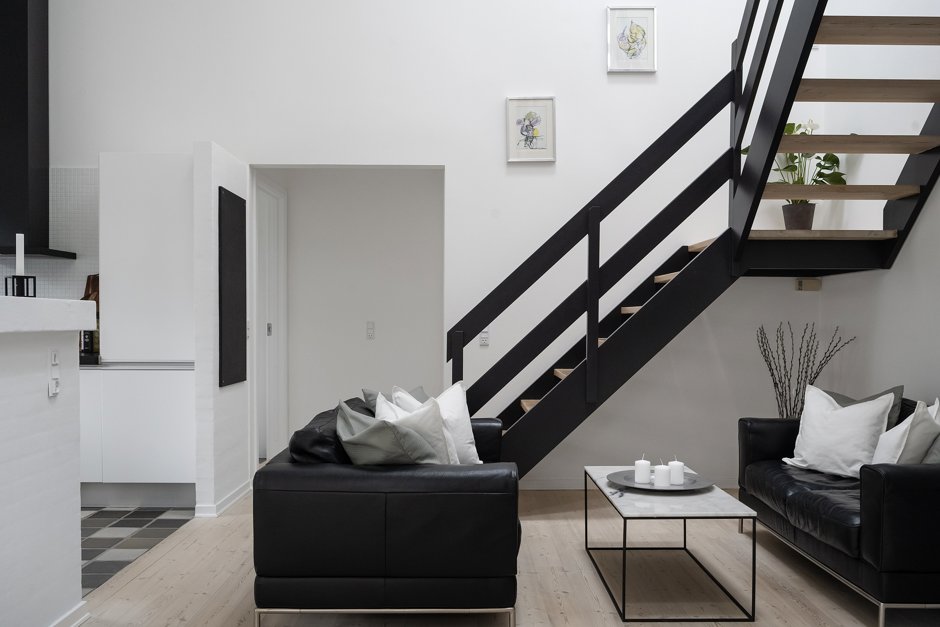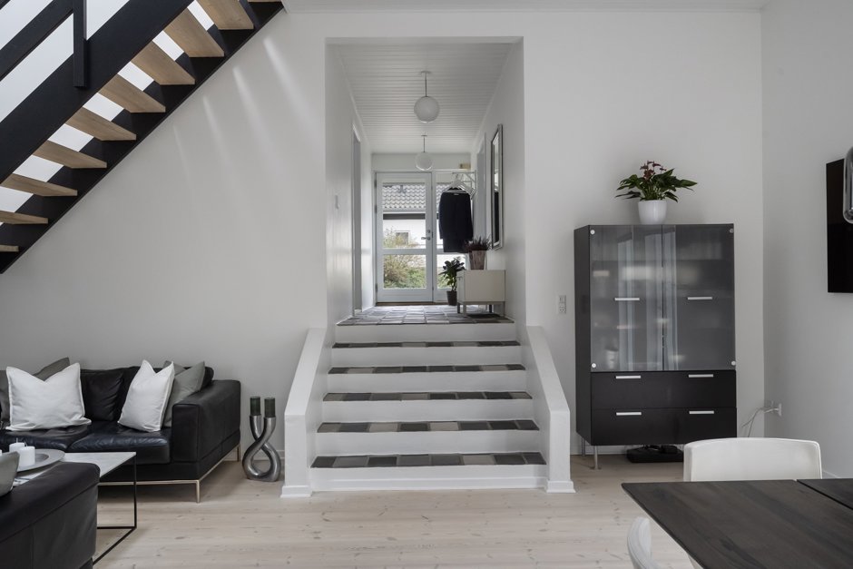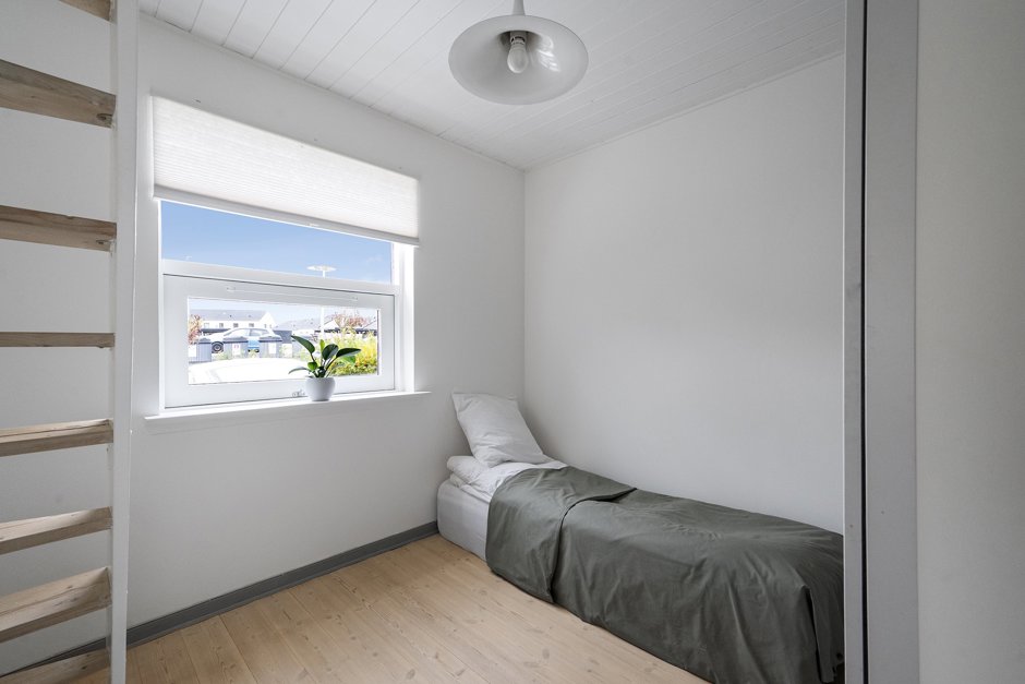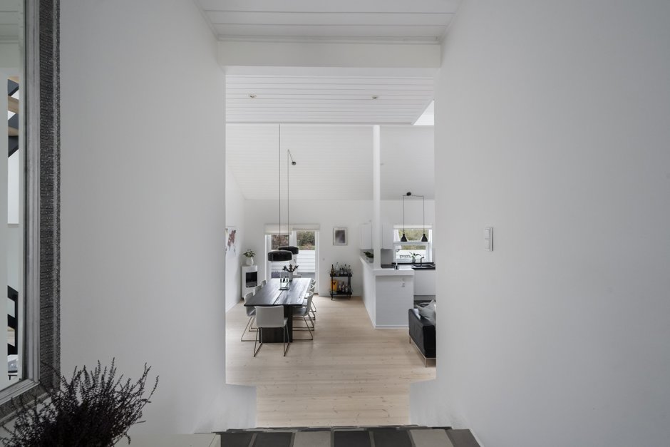 Indenfor bliver du mødt af en entré med adgang til et stort værelse samt et rummeligt badeværelse. Badeværelset har tidligere været opdelt, så hvis man ønsker endnu et værelse, er der mulighed for at etablere det igen. Fra entréen træder du videre ind i det store alrum, hvor loftet er ført helt til kip, hvilket giver en fantastisk følelse af plads. Herfra er der adgang til køkkenet og trappen til førstesalen.