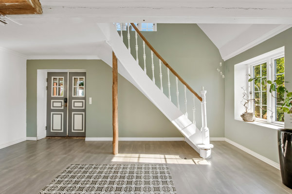 Bag hoveddøren venter et moderne, stilfuldt hjem med flotte detaljer som stukkatur, høje paneler og synlige loftsbjælker, ligesom I får Dannebrogsvinduer, gulve beklædt med smukt sildeben og god plads til at leve det gode liv som familie og i gode venners selskab.