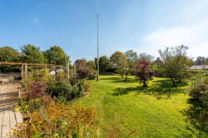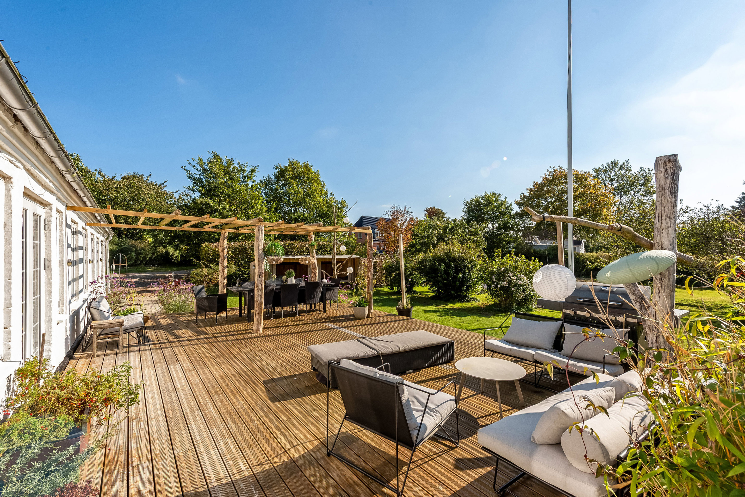 Udendørs venter en have, der er så velanlagt og indbydende, at man - trods husets gennemførte indre - vil tilbringe en rum tid ude. Her får I en smuk, sydvendt terrasse og en plæne, hvor ungerne vil elske at lege. Der er også et shelter – naturligvis stort nok til at hele klanen kan overnatte ude – samt frugttræer, stedsegrønt og en bålplads, hvor snobrød og skumfiduser kan binde store og små sammen.