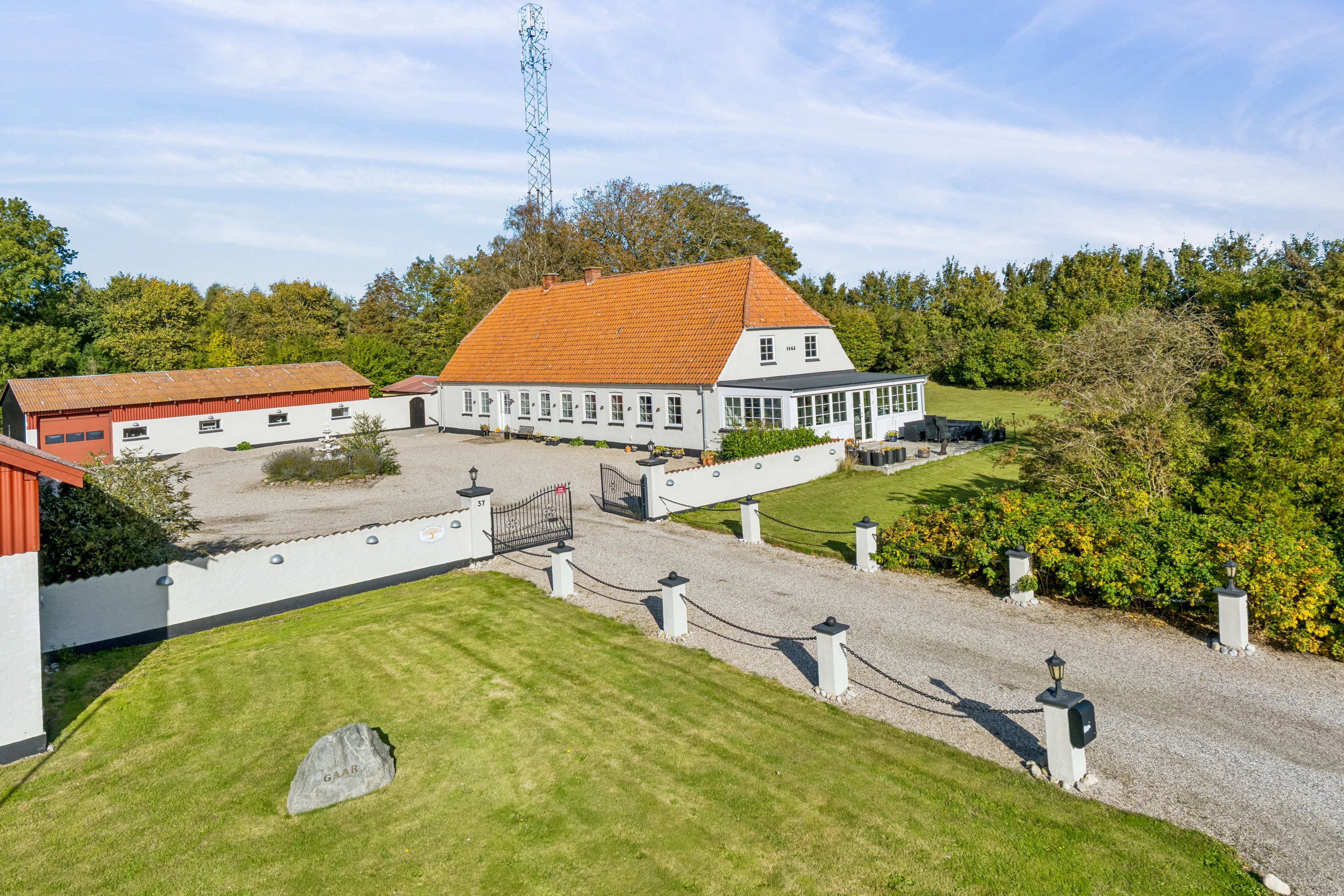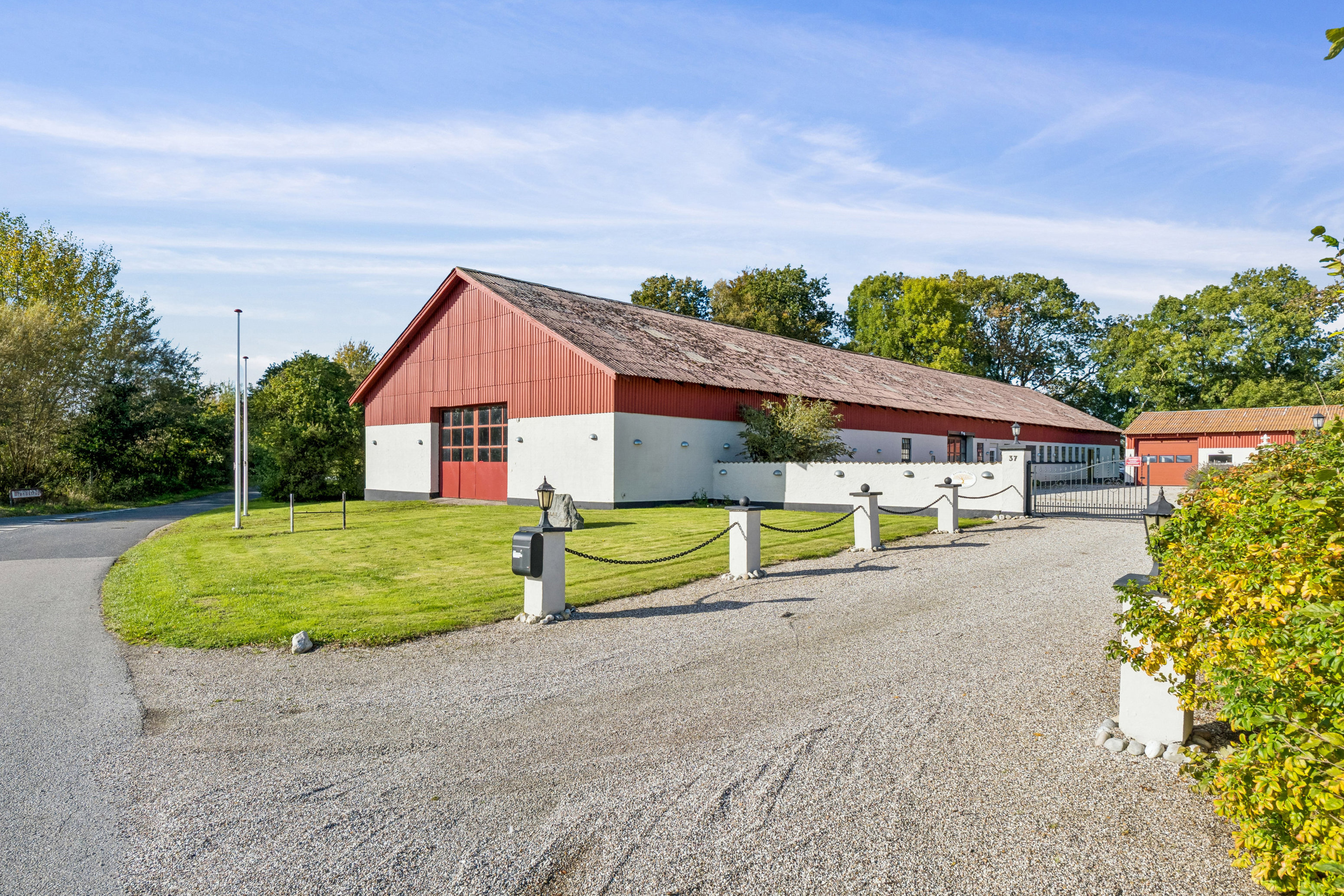 Udenfor venter en flot og præsentabel gårdsplads indhegnet af en halvmur og smuk låge. Herfra er der adgang til en meget stor garagebygning med el-port samt en imponerende udhusbygning med el-port og på hele 760 m². Disse bygninger giver et væld af anvendelsesmuligheder – ideelt for håndværksmesteren, samleren eller den pladskrævende hobby.