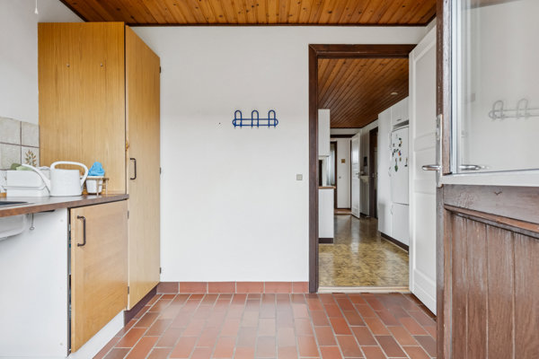 Boligen byder på en indbydende entré, som leder ind til husets samlingspunkt, køkkenalrummet. Her er rigelig bord- og opbevaringsplads, og køkkenet er praktisk indrettet langs væggene, så arbejdszonen fungerer godt. De store bordflader indbyder til madlavning, mens familien samles omkring spisebordet. Fra køkkenalrummet er der åben forbindelse til opholdsstuen med rar atmosfære og gode indretningsmuligheder til både spiseafdeling og sofaarrangement.