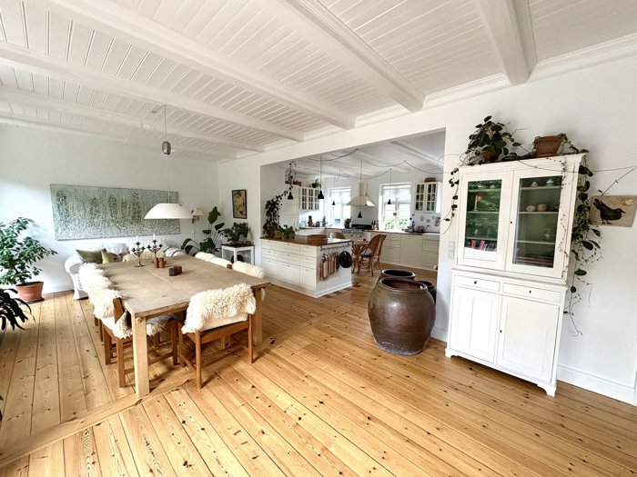 Boligen fremstår indbydende og velholdt med et nyere tag fra 2025, som både sikrer et flot helhedsindtryk og giver tryghed i mange år frem. Indendørs mødes du af en lys og luftig stemning, hvor det høje loft bidrager til en fantastisk rumfornemmelse. De store opholdsrum får masser af naturligt lys, hvilket skaber en varm og imødekommende atmosfære i hele hjemmet.