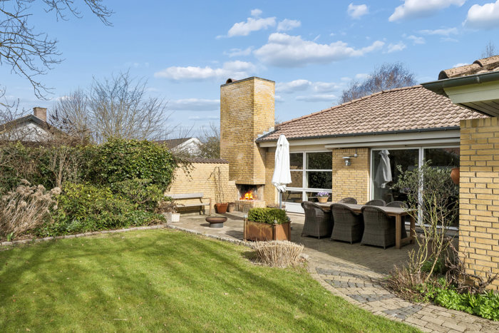 Fra alrummet er der direkte udgang til en solrig terrasse mod syd med flisebelægning og markise – et oplagt sted at nyde sommeren i rolige omgivelser.