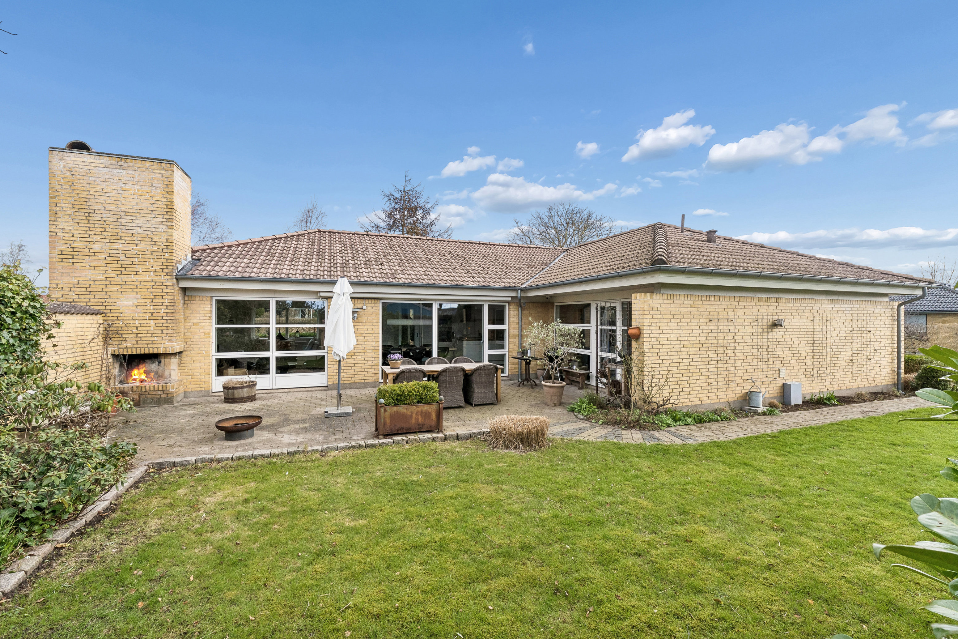Boligen byder velkommen via en pæn entré, der naturligt leder videre ind i villaens skønne opholdsmiljøer. Til højre finder du en indbydende og hyggelig TV- og pejsestue i flere sektioner med store gulv-til-loft vinduespartier, som sikrer et fantastisk lysindfald og en smuk udsigt til haven og terrassen.