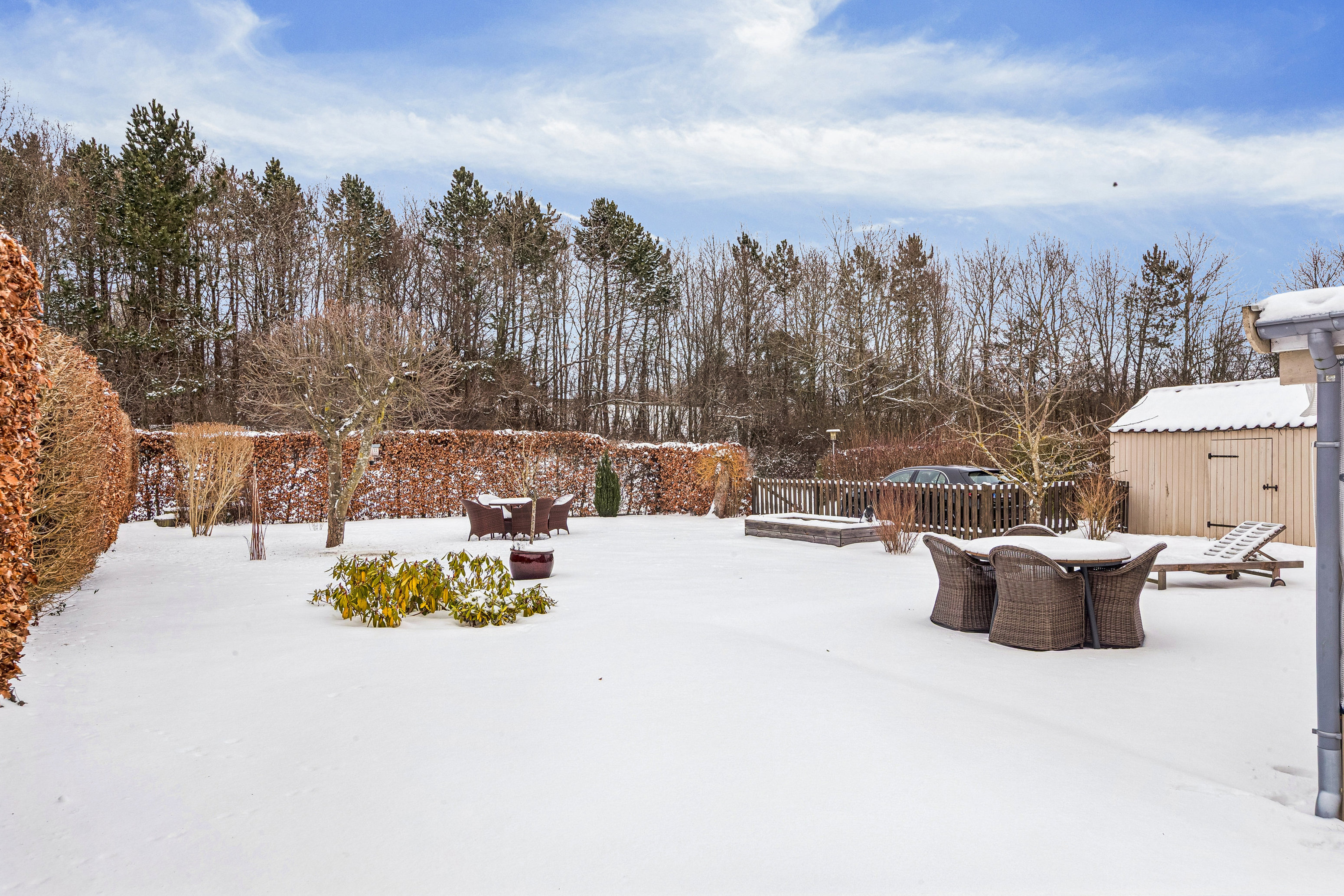 Fra opholdsstuen er der udgang til en overdækket terrasse, som opleves som et ekstra opholdsrum og forlænger udesæsonen betydeligt. De gode læforhold gør, at terrassen kan benyttes det meste af året og danner en naturlig ramme om både måltider, afslapning og hyggeligt samvær. Herfra er der videre adgang til en stor fliseterrasse samt en veltrimmet og nem have, som tilsammen skaber et særdeles indbydende udemiljø.
