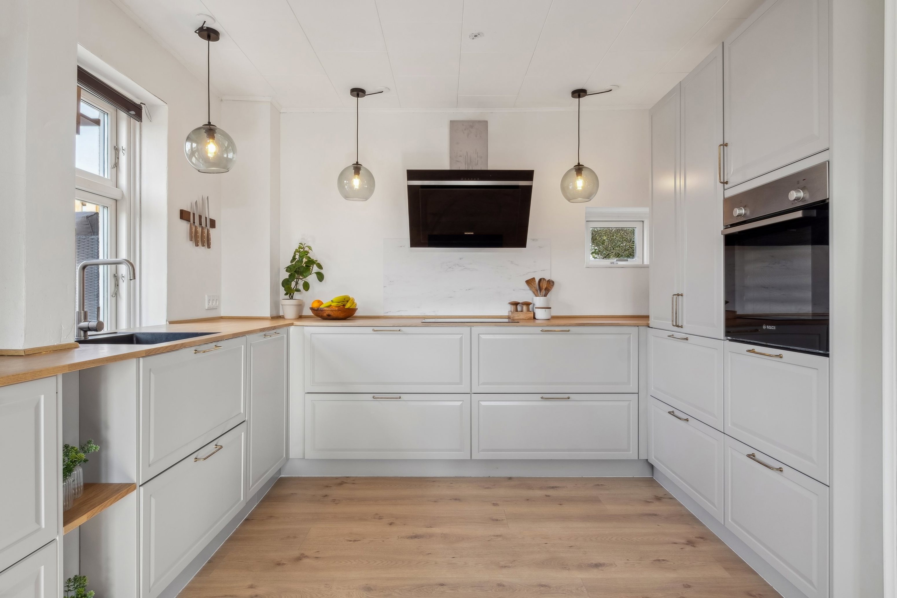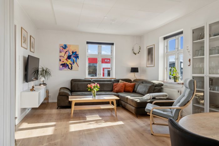 Stueplanet byder på et lyst og indbydende opholdsrum med fine originale detaljer og en varm stemning. Herfra er der adgang til et nyt og funktionelt køkken, hvor der er tænkt over både æstetik og praktik.