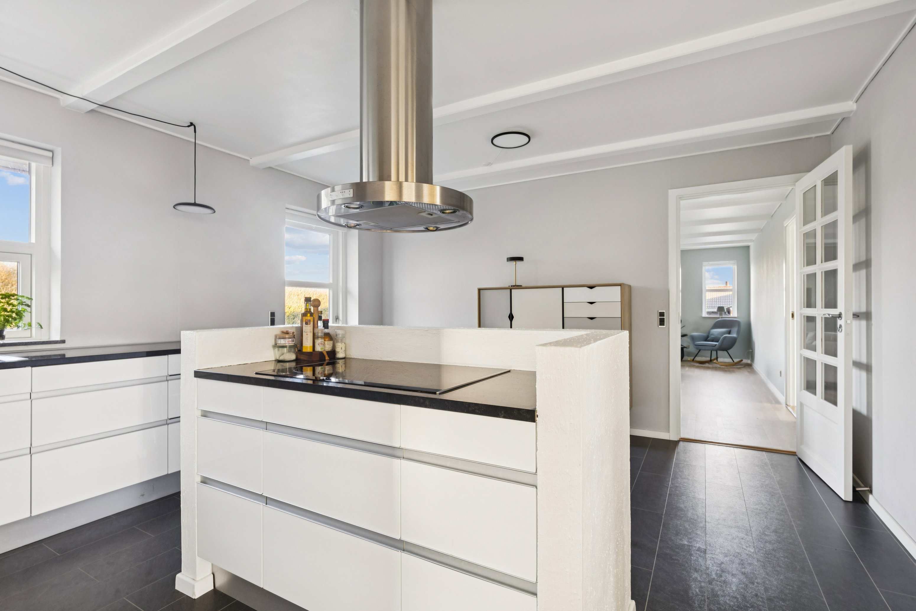 Indenfor opleves et naturligt flow fra entré til køkken og videre til stuen, der fungerer som boligens samlingspunkt. Her inviterer rummet til rolige stunder med udsigt til have og grønne omgivelser. Huset er blevet løbende vedligeholdt - senest med installation af fjernvarme, nye gulve i stue og to værelser, samt nye fuger på badeværelset. Et praktisk bryggers fuldender de indvendige rammer.