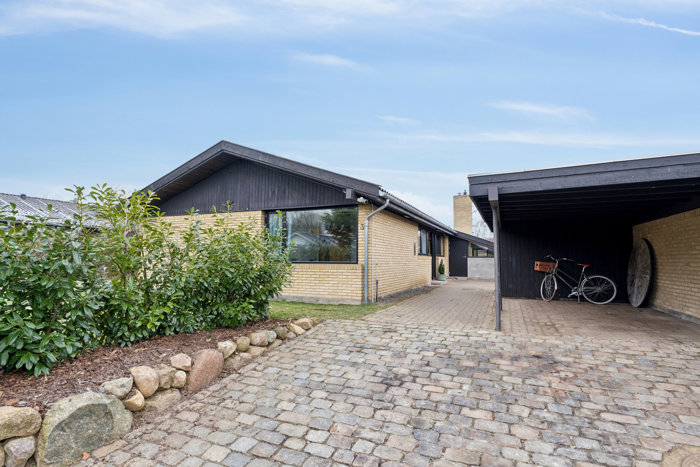 Allerede udefra imponerer ejendommen med sin fine gule murstensfacade, og de nyere vinduer samt taget giver boligen et moderne præg. Foran hjemmet har I carporten med tilknyttet skur, og efter I har parkeret, kan I bevæge jer indenfor enten via entréen eller gennem det praktiske bryggers med opbevaringsplads og rum til vaskefaciliteterne.