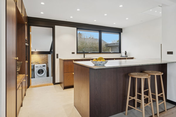 Det nyere, stilrene køkken udgør et naturligt samlingspunkt. Her er god plads til både madlavning og samtale, og fra køkkenet er der åben forbindelse til alrummet og stuen, hvor loft til kip, trælofter og pejseindsats skaber en varm atmosfære. Her vil I ligeledes blive betaget af det store vinduesparti, som gavmildt lukker dagslyset ind og skaber en helt særlig indbydende stemning i rummet.