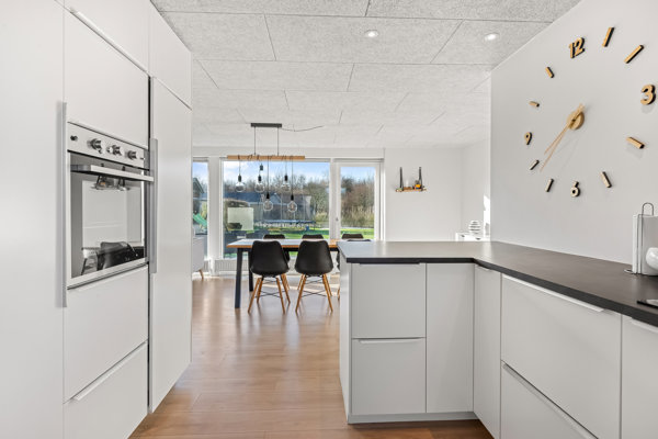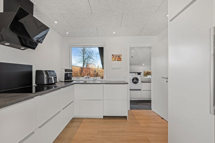 Indenfor mødes I af et venligt miljø, hvor materialerne understøtter den rolige atmosfære. De gennemgående gulve og de hvide overflader danner en harmonisk base, som er let at indrette personligt. Køkkenalrummet bliver hjemmets naturlige samlingspunkt med glatte fronter, god bordplads og en gennemtænkt indretning, mens de store vinduer trækker omgivelserne indenfor. Den tilstødende stue skaber en skøn ramme om afslappende aftener og hyggelige stunder med fin kontakt til terrassen.