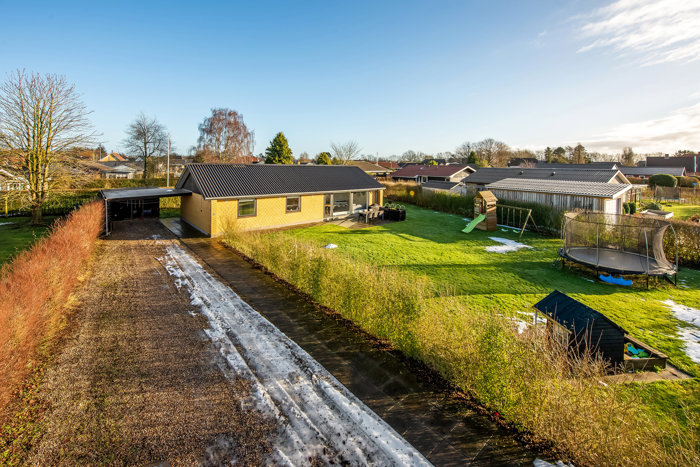 Nærområdet er roligt og børnevenligt med lukkede veje og grønne omgivelser. Du bliver en del af et aktivt lokalmiljø med velfungerende foreningsliv, skole, dagtilbud og indkøb i overskuelig afstand. Der er samtidig kort vej til byens øvrige faciliteter og nem adgang til motorvejen, så pendling mod større byer fungerer smidigt. Kombinationen af det moderne indre, den ugenerede have og de trygge omgivelser giver en dejlig base for familielivet.