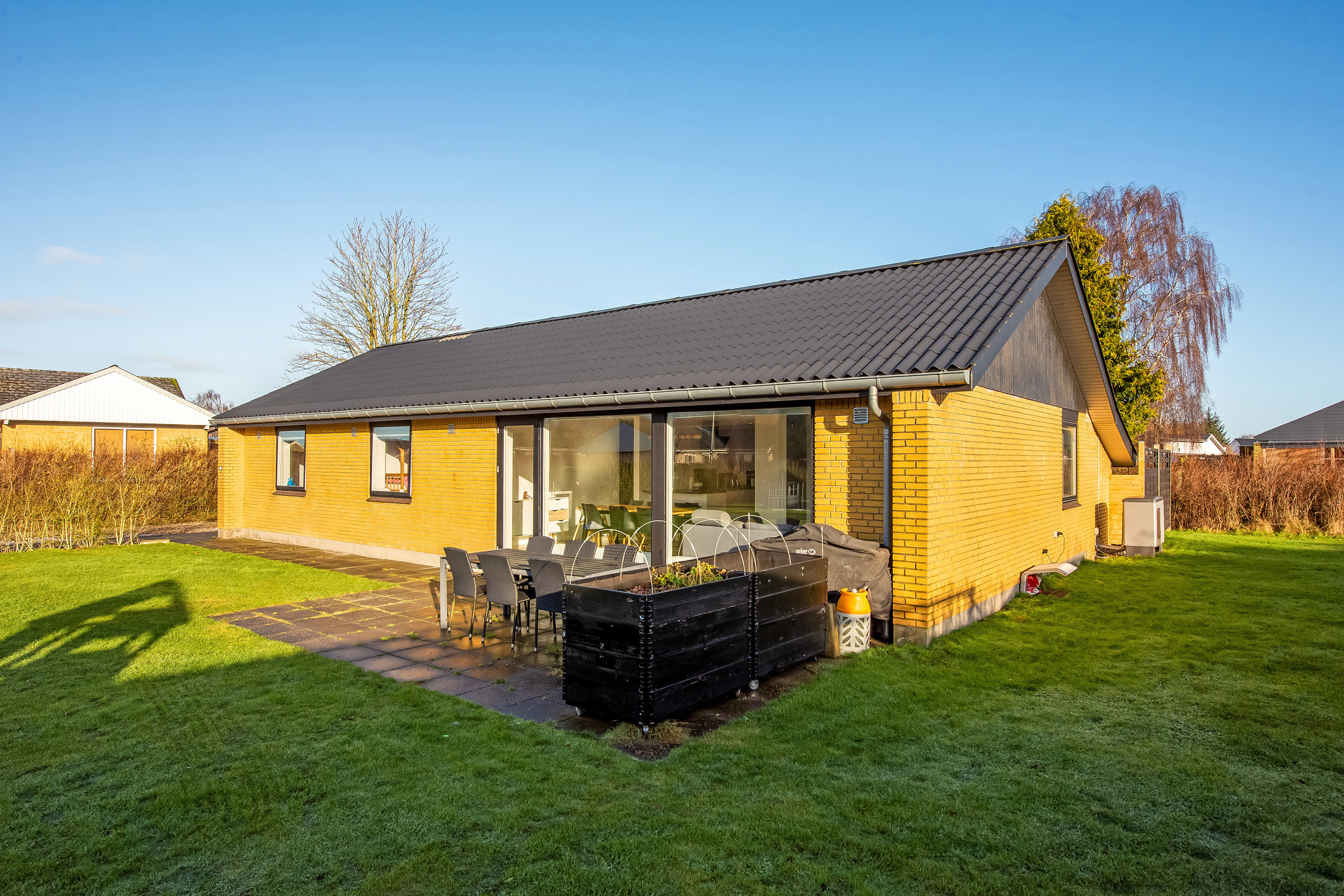 Udenfor venter en skøn have med god plads til leg, afslapning og udeliv. Her er luft omkring huset og en behagelig fornemmelse af privathed, så sommerdagene kan nydes i fredelige omgivelser, hvor både børn og voksne kan trives.