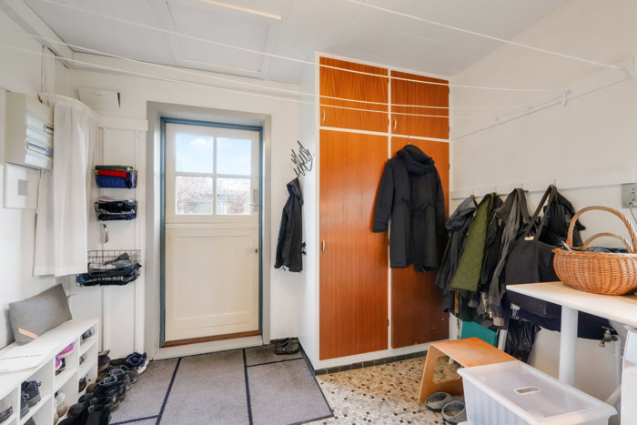 Villaen er fra 1966, og i 1997 skiftede man vinduerne. Havedøren er fra 2007, og sidenhen har man moderniseret varmekilden til en luft-til-vand-varmepumpe. Samme pæne billede tegner sig indenfor, hvor originalt inventar blander sig med velvalgte opdateringer. Faktisk er det noget af en gevinst, at huset fortsat er udstyret med de oprindelige, gedigne trædøre, for de passer til boligens mange originale indbygningsskabe. Et lyst gulv i bøgeparket bidrager til villaens lette stemning, mens både gæstetoilettet og det store bryggers stadig er udstyret med et karakteristisk gulv i stiftmosaikker.