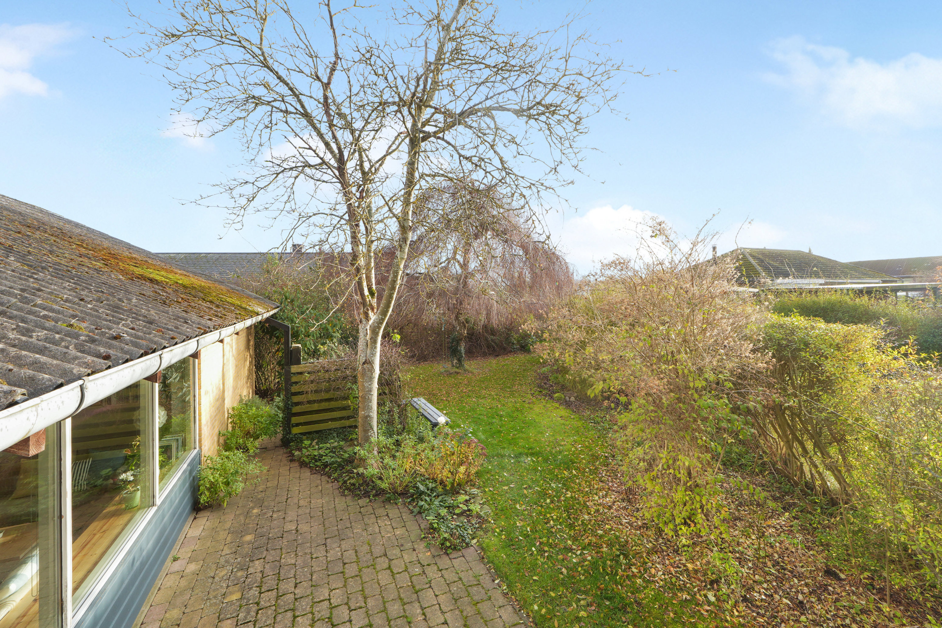 Omvendt er det rummelige spisekøkken flot opdateret i 1999. Ovn og kogeplade er fra dén tid, men opvaskemaskinen fra Bosch og køle-fryseskabet fra Liebherr er kun få år gamle. Køkkenet er desuden ikke alene om at være rummeligt – faktisk er det et karaktertræk for de fleste rum. Det gælder især for den store, lyse, sydvendte stue, som har udsigt til den dejlige have, og skulle et ekstra værelse komme på tale, kan den ene ende konverteres. Reelt får I to store værelser, men det ene har tidligere været delt i to og kan nemt tilbageføres. I den brede mellemgang kan I finde plads til hjemmekontoret, og dertil mangler vi bare at runde badeværelset, som har tidløse, hvide vægklinker – ligesom gæstetoilettet.
