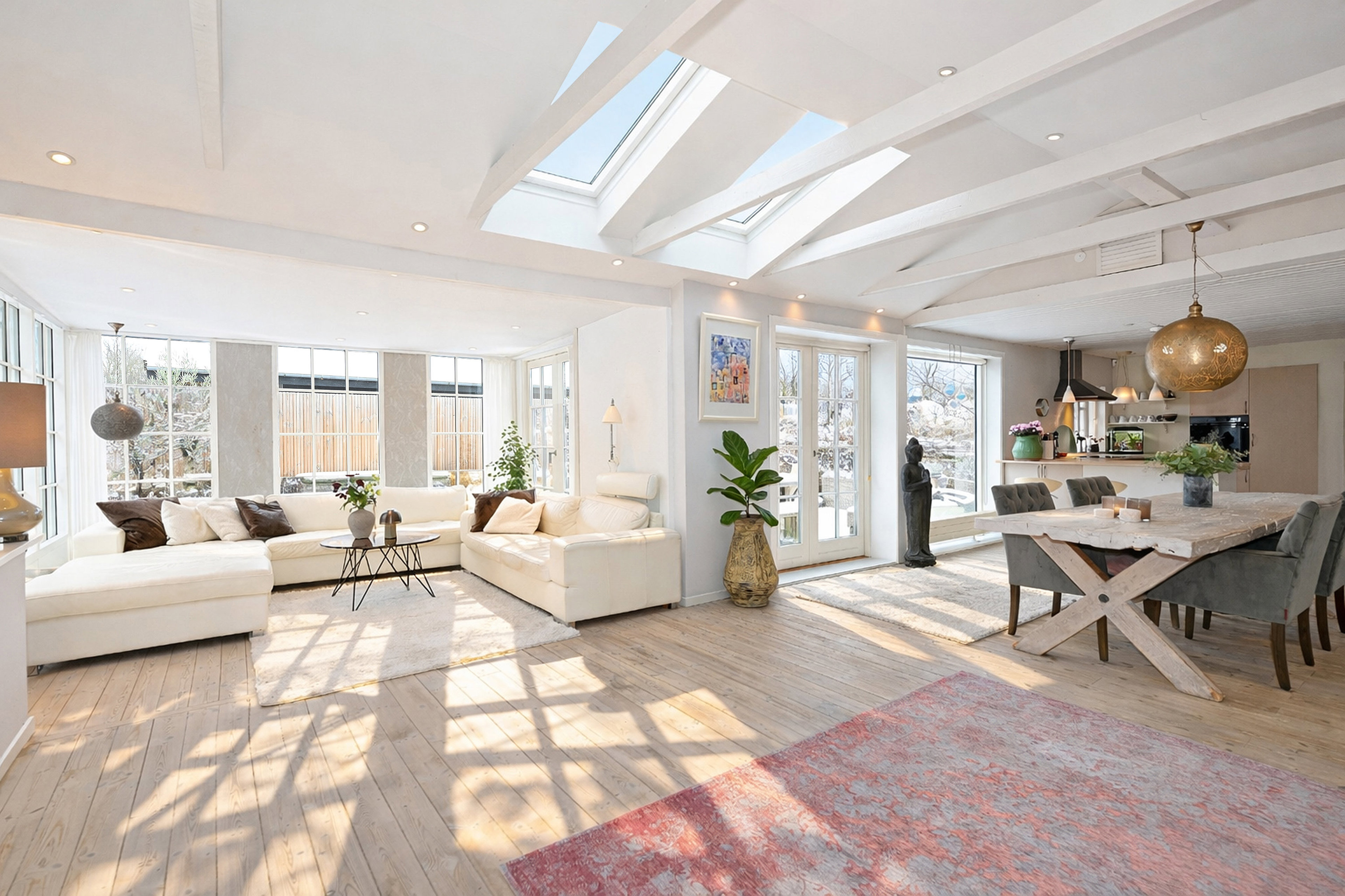 Planløsningen er både generøs og gennemtænkt. 195 m² fordeler sig med tre værelser og et mindre kontor samlet i den ene ende, mens hjemmets hjerte folder sig ud i den anden. Køkken og stue smelter sammen i et lyst opholdsmiljø, hvor samtaler flyder, og middage trækker ud. Dertil kommer to smukke badeværelser og et praktisk bryggers, der får hverdagen til at glide ubesværet.